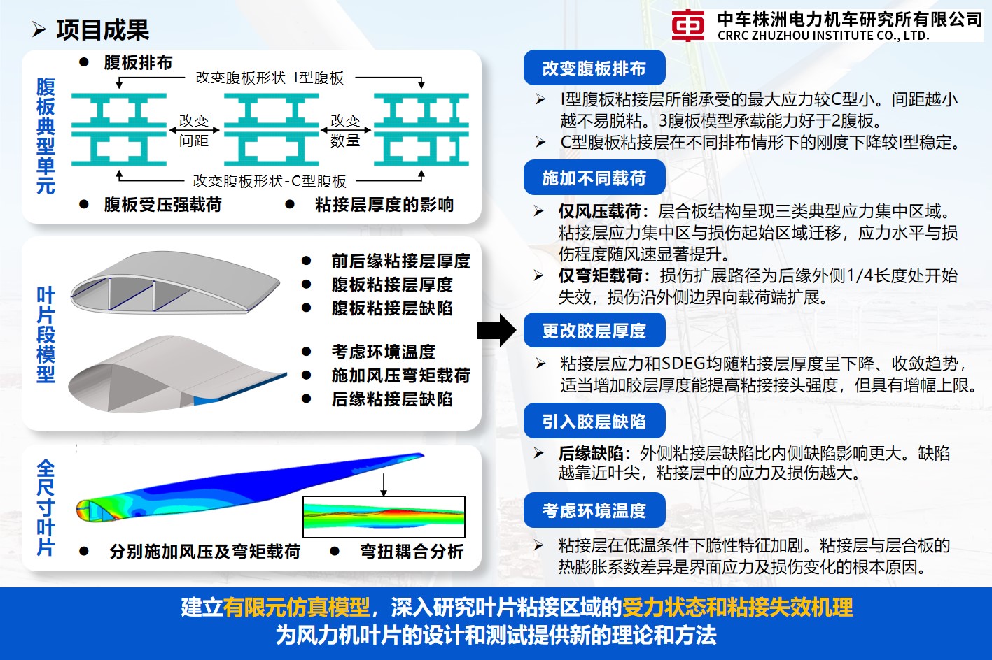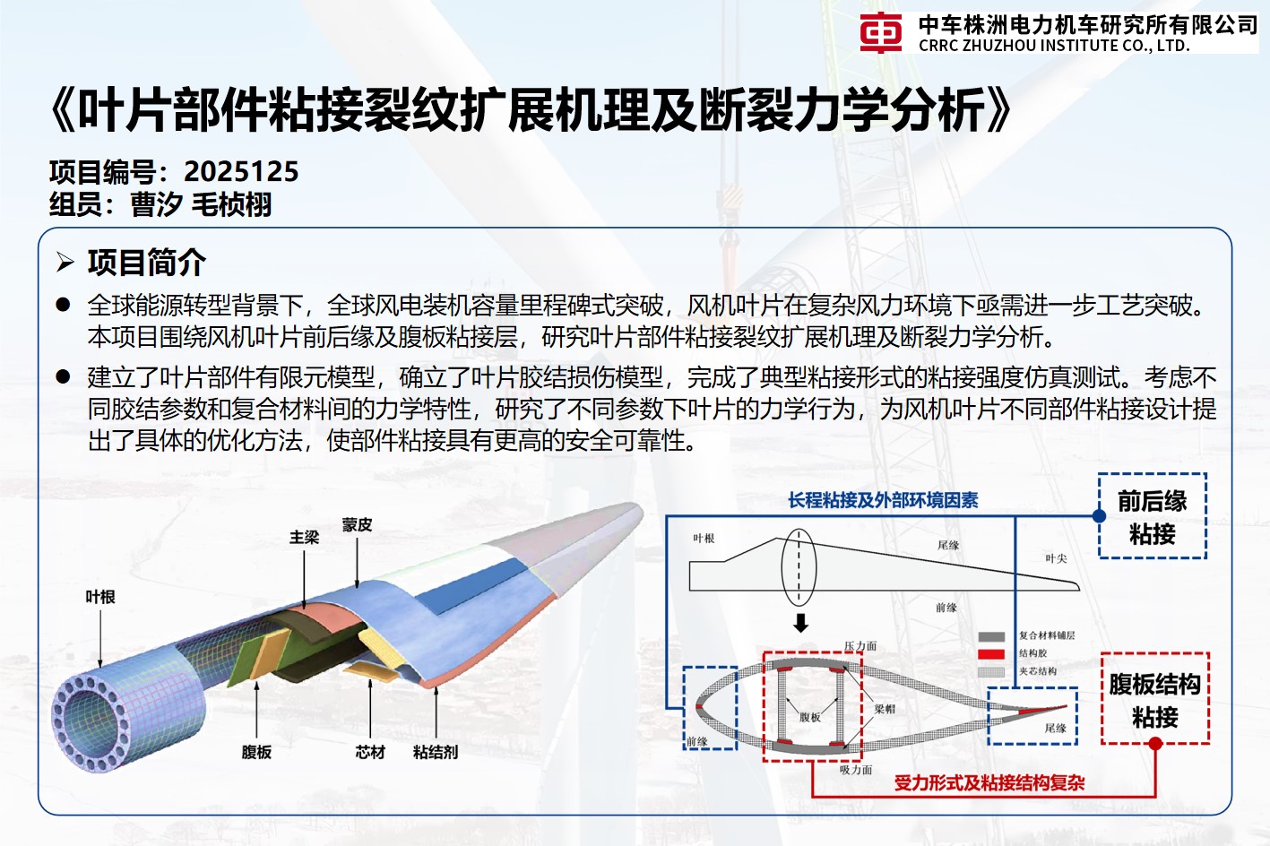 分别对风机叶片前后缘和风机叶片腹板结构进行研究,通过建立有限元仿真模型,深⼊研究叶片粘接区域的受力状态和粘接失效机理,本项目将为风力机叶片的设计和测试提供新的理论和方法。