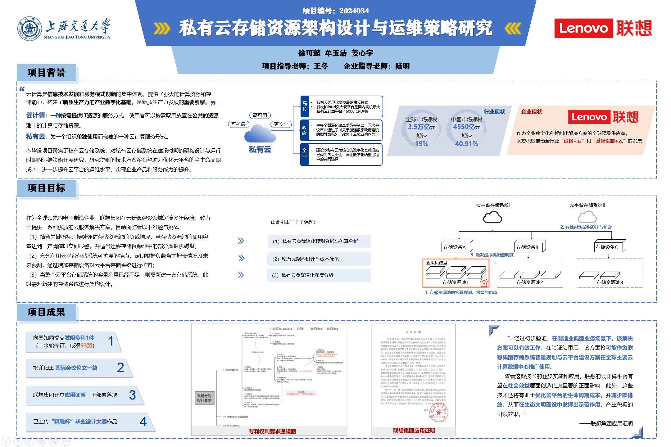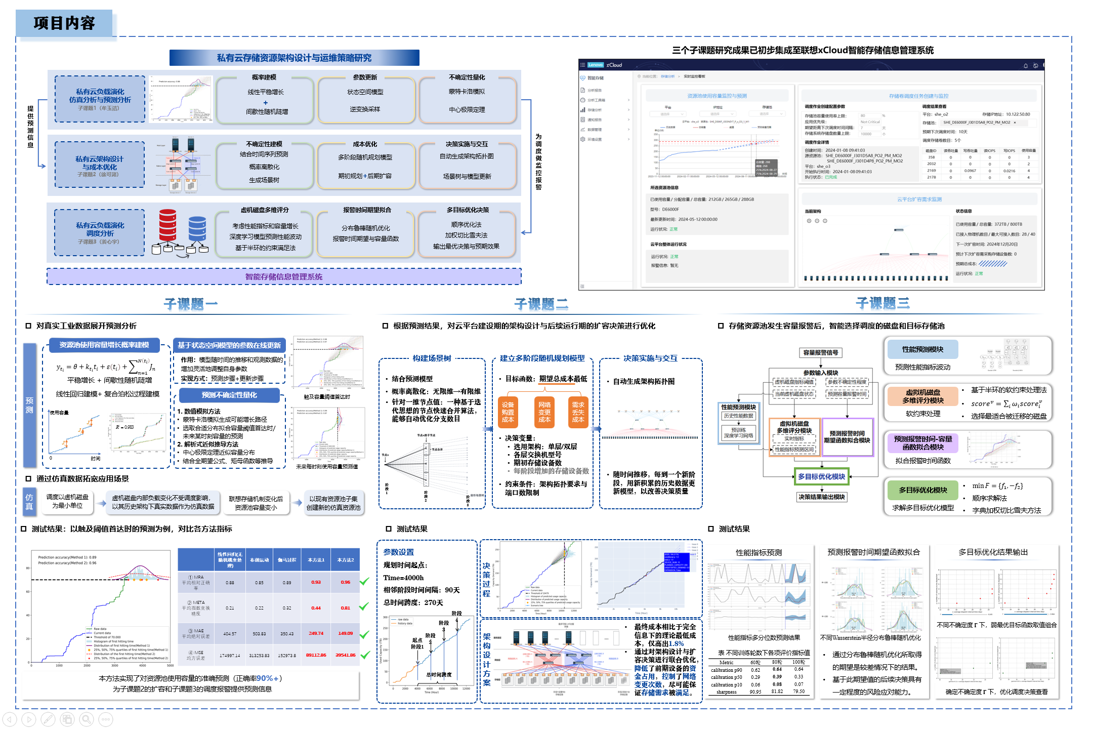本项目开发的私有云存储资源架构设计与运维系统能够面向云平台生命周期的容量预测、架构设计与主要设备选型、存储资源调度等方面进行联合优化并开展必要预测性维护工作。目前本项目方案正在联想多个云平台环境中进行测试与试运行。经过初步验证,在制造业典型业务场景下,本项目方案可以有效工作。验证结束后,本方案将可能作为联想集团存储系统容量规划与云平台建设方案在全球主要云计算数据中心推广使用。
