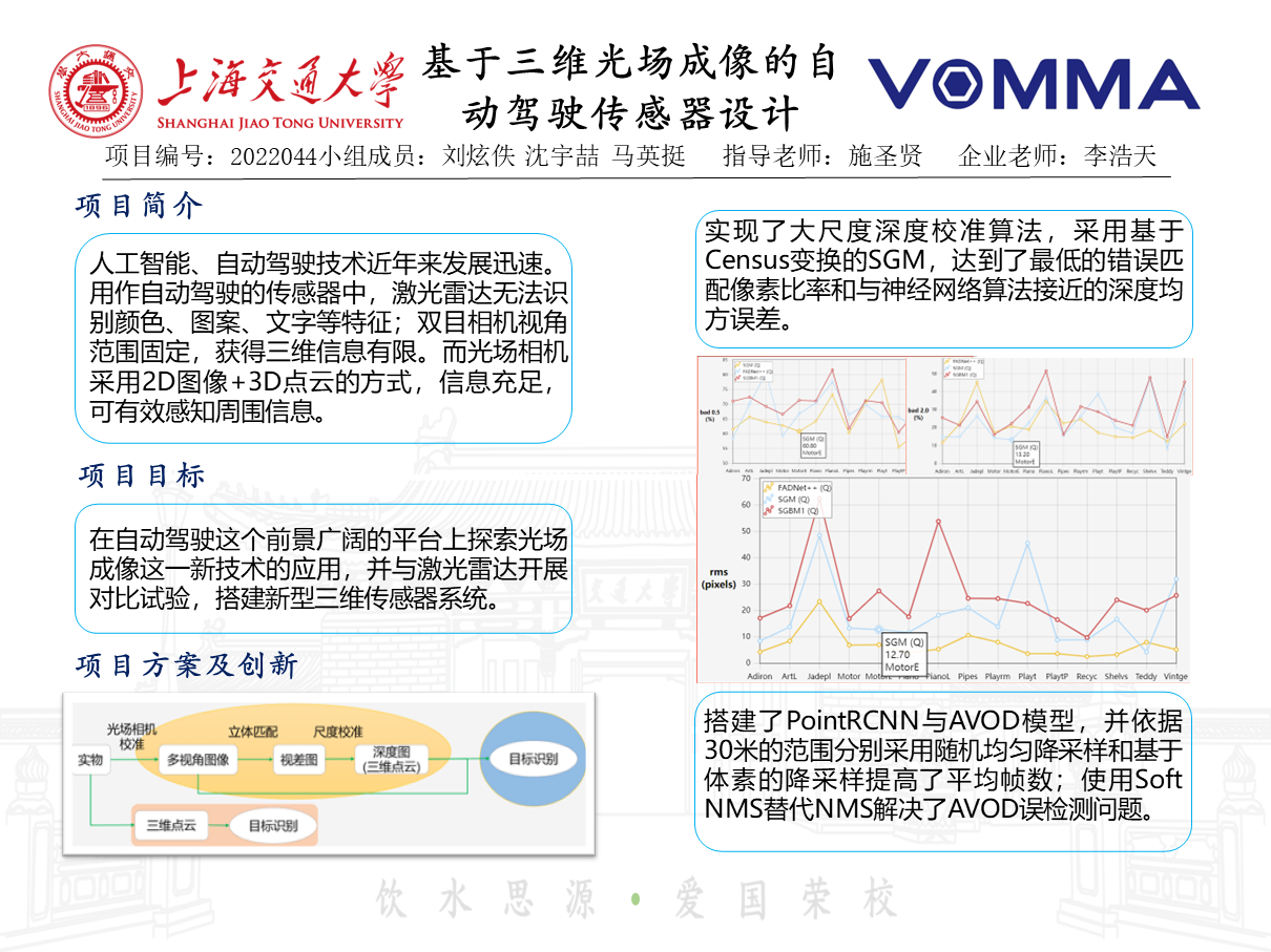 本毕业设计意图在自动驾驶平台上探索光场成像这一新技术的应用,并与激光雷达展开对比,搭建起新型三维传感器系统。毕设完成了大尺度光场深度校准算法开发和道路模型检测算法开发,以及与激光雷达点云数据进行对比验证了系统的可行性。