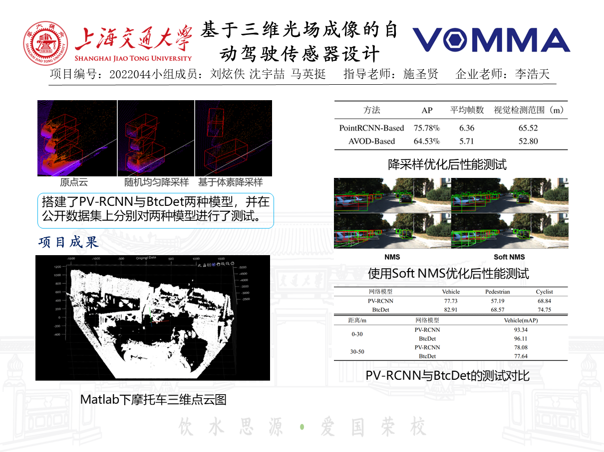 应用理想双目成像模型以及半全局视觉立体匹配算法发展大尺度深度校准算法,利用光场相机对环境深度信息进行提取以及对三维信息进行重构。基于深度学习和传统目标识别算法PointRCNN和 AVOD,开发光场相机三维点云及二维多视角图像数据处理算法。搭建激光雷达点云数据处理深度学习网络PV-RCNN、BtcDet,实现对典型目标的识别,并开展多种算法的对比分析。开展室内试验,采集多种模拟场景光场点云数据,验证光场相机在自动驾驶应用的可行性。