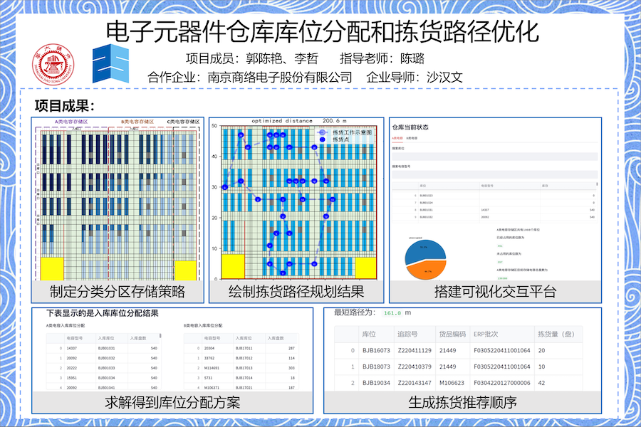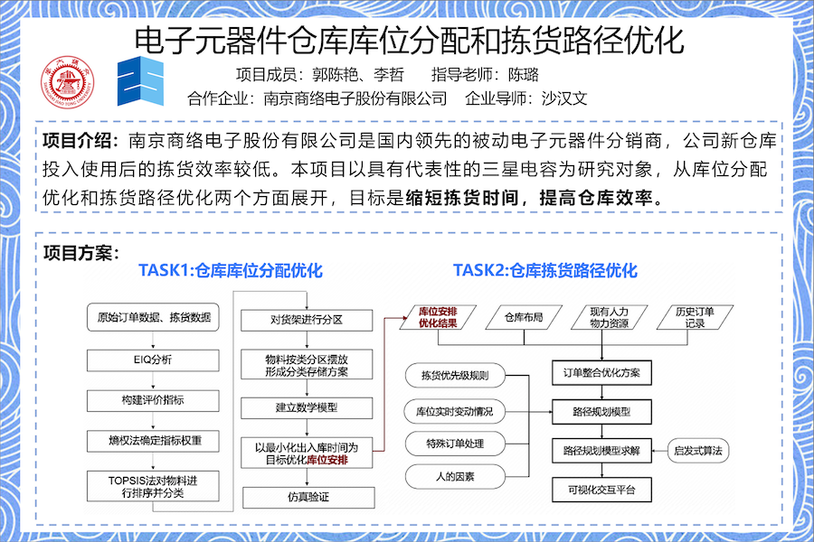 南京商络电子股份有限公司是一家国内领先的被动电子元器件分销商,主要面向网络通信、消费电子、汽车电子、工业控制等应用领域的电子产品制造商,为其提供电子元器件产品。随着公司业务的不断发展,公司在南京滨江开发区新建了自己的供应链基地并于2022年10正式搬入供应链基地的新仓库。对于新仓库投入使用后存在的拣货效率有待提升的问题,本项目规划调整仓库库存电容的库位分配,并且设计拣货路径规划方式,缩短公司仓库电容入库、出库平均时间,并搭建仓库作业交互管理平台,提升企业仓库运作效率。