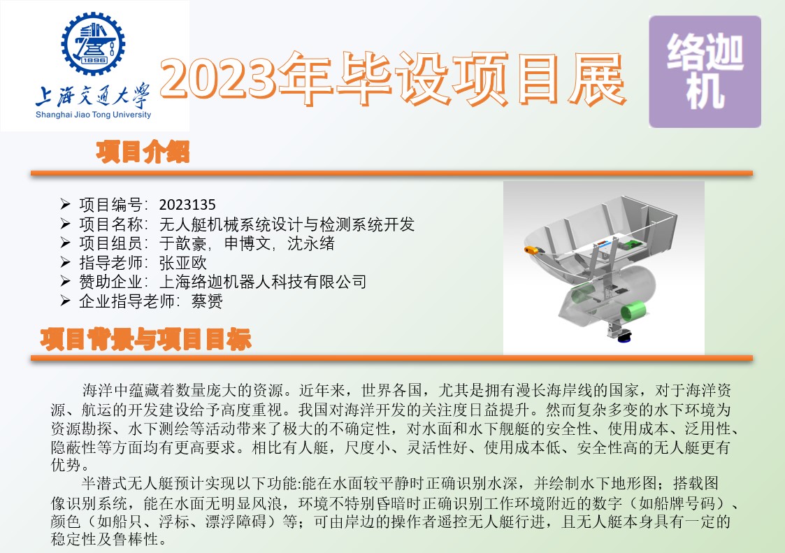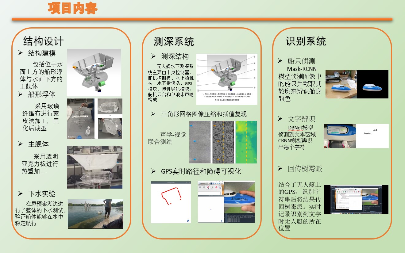设计一种半潜式无人艇,在能够在水域中稳定航行,并能够搭载测深系统以及摄像头等识别系统组件的空间与接口。对于目标识别系统。我们以深度学习为核心,将船只、船牌号以及一些标语设定为主要的识别目标。对于水下测深系统,我们将测声学与视觉手段相结合,共同构建水下地形图;对地图进行处理完成地图复现;具备实时地图可视化功能,便于监控附近障碍物。以树霉派作为控制中枢进行多线程操作,以实现避障、目标侦测等功能。