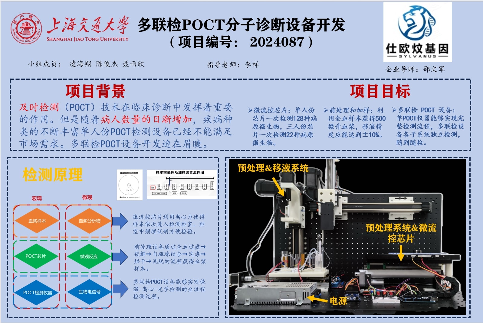 开发多联检POCT分子诊断设备及其配套微流控芯片1、微流控芯片设计与微液滴驱动方法研究;参考现有单人份微流控芯片,设计可容纳4人份样本并检测20种病原体的微流控芯片,研究微液滴驱动方法,确定稳定可靠的驱动方式,仿真外力作用下微液滴在微流控芯片中的流动;针对单人份样本,设计满足超多重(≥150种病原体)检测要求的微流控芯片,优化微反应孔、微流控阀门、核酸提取腔室等结构及其在芯片上的分布,将芯片外径控制在160mm以内。2、芯片自动加样与封装系统开发;根据现有的微流控芯片结构以及测试前需要加入的检测试剂,开发微流控芯片自动加样装置,实现样本、磁珠、液态石蜡、缓释液等液态试剂的一次性自动加装;开发薄膜贴附封装机构,实现微流控芯片各腔室、流道的封装。3、多联检POCT设备软硬件系统开发;根据现有POCT设备内部架构,设计多联检POCT设备硬件系统架构,合理分布设备中的磁铁、导轨、电机、温控模块、荧光检测模块、控制板卡以及触摸屏等元器件和机构;在现有的POCT设备控制软件基础上开发多联检POCT设备软件系统,独立控制各微流控芯片的入仓和出仓,实现随到随检;在线监控设备卡槽内是否有微流控芯片,实时显示检测进程。