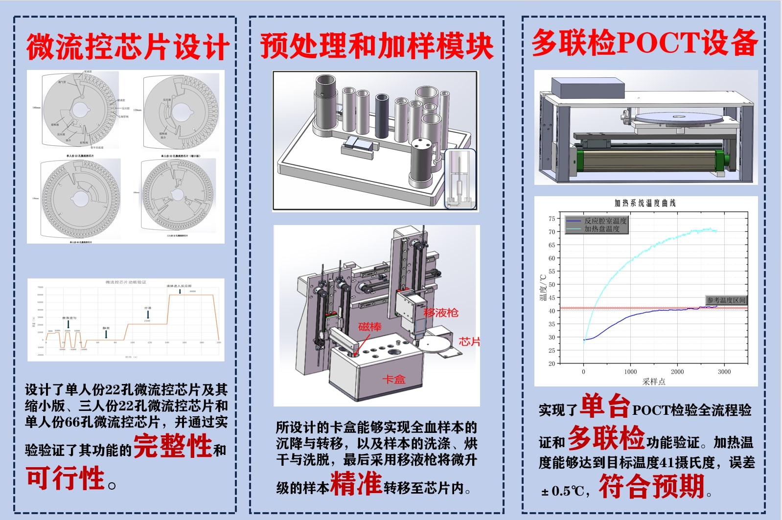 样本预处理及自动加样装置开发部分,所设计的卡盒能够实现全血样本的沉降与转移,同时按需添加其余试剂进行加温控制,再通过磁棒吸附磁珠在各个腔室内移动,实现样本的洗涤、烘干与洗脱,最后采用移液枪将微升级的样本精准转移至芯片内。
