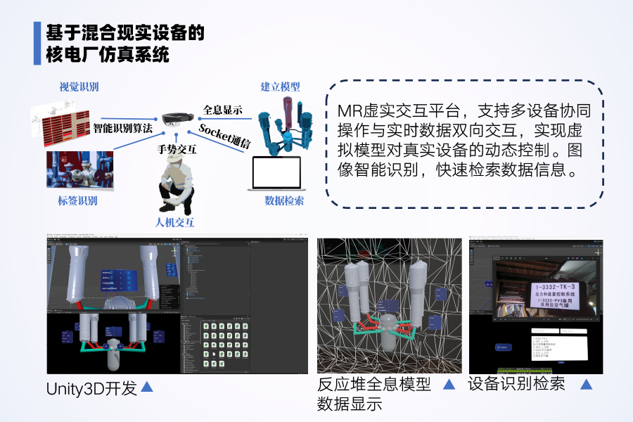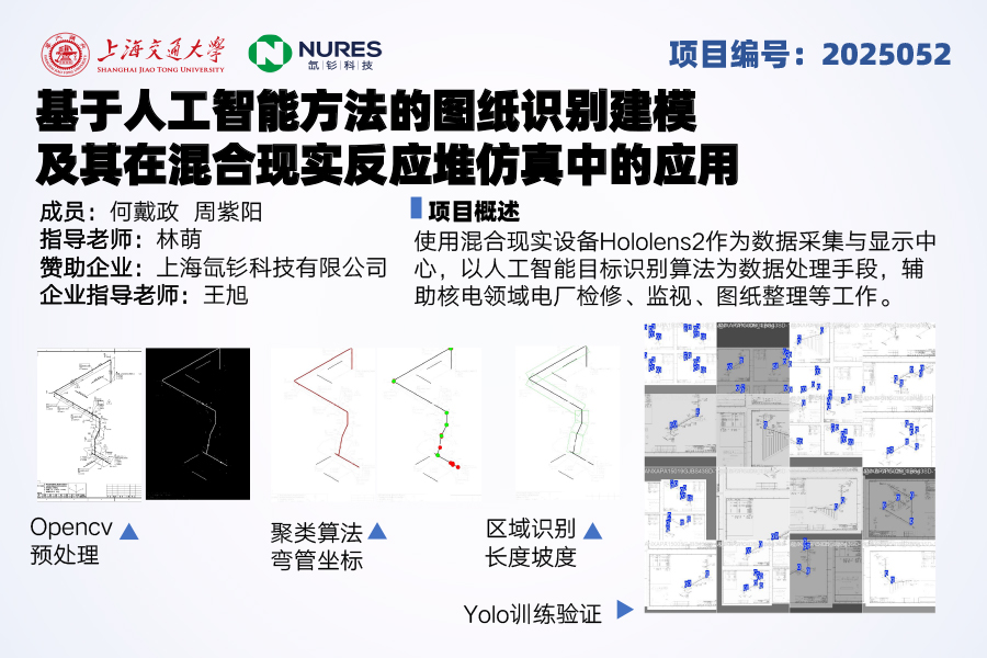 本项目以核能行业数字化转型为背景,聚焦核电站图纸识别效率低、建模流程复杂等痛点,提出“基于人工智能方法的图纸识别建模及其在混合现实(MR)反应堆仿真中的应用”。项目由beat365中文官方网站beat365中文官方网站与上海氙钐科技有限公司合作开展,旨在通过深度学习技术(如YOLO算法)实现核电站图纸的自动化识别与建模,并结合MR技术构建虚实交互的仿真平台。具体内容包含两部分:一是开发图纸智能解析系统,自动提取管道布局、设备参数等关键信息并生成三维模型;二是基于HoloLens2设备实现多机协同、实时数据交互的MR仿真应用,支持核电站设计、检修等场景的虚拟操作。项目通过技术创新推动核能行业智能化升级,助力“双碳”目标实现,兼具工业应用价值和市场潜力。