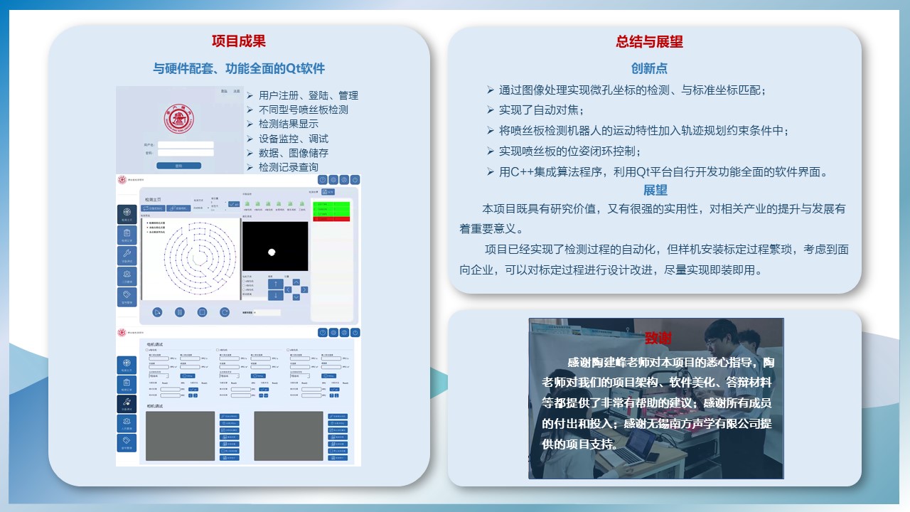 本项目分为图像处理、轨迹规划、运动控制、软件集成四部分:图像处理负责获取微孔全局坐标以及根据微孔图像判断微孔是否堵塞,轨迹规划负责找出遍历微孔的最优路径,提高检测效率;运动控制负责按照既定轨迹遍历微孔,并保证运动的快速和稳定;最后基于Qt平台利用C++语言开发自动检测软件,以满足企业需求。