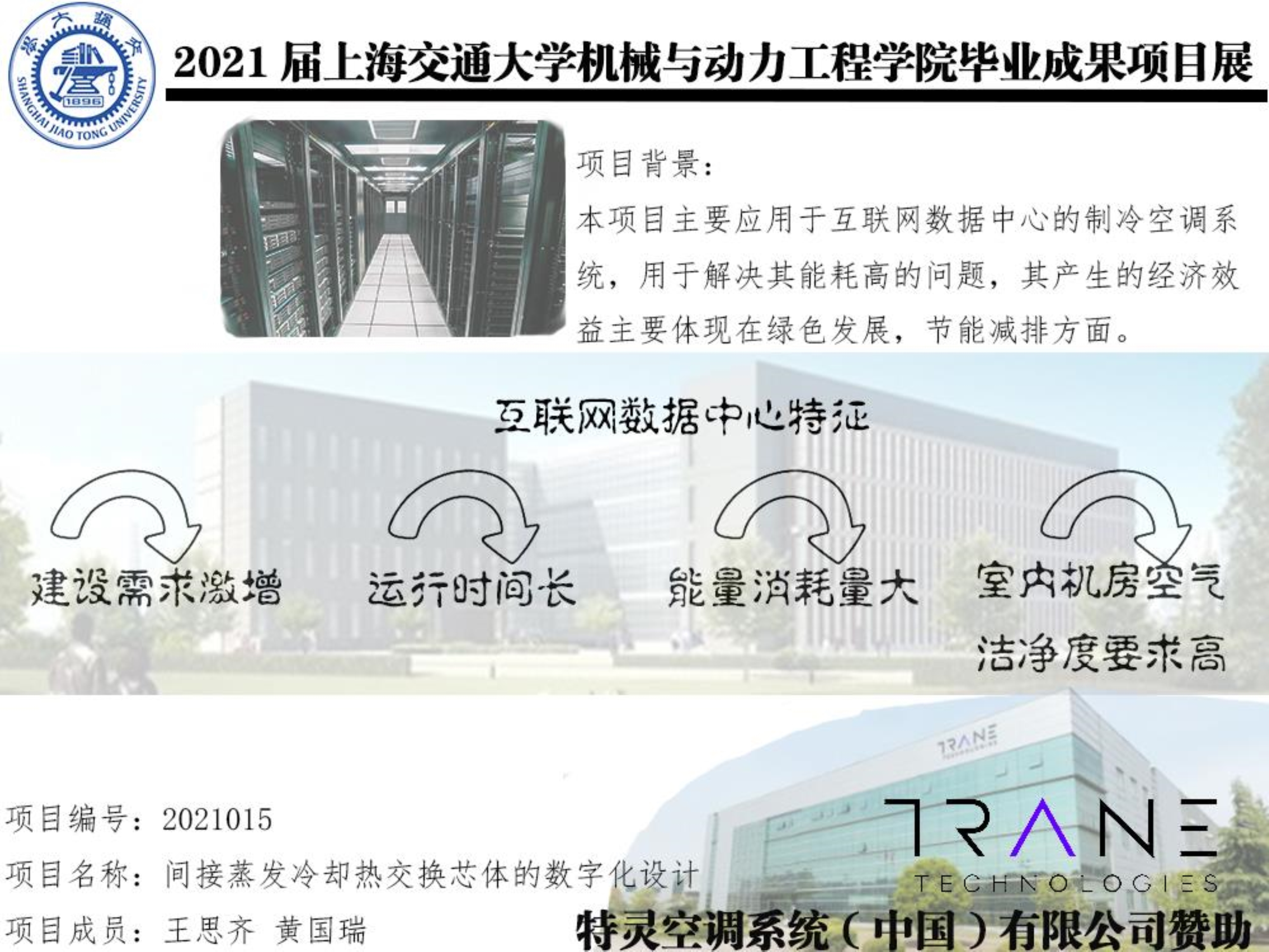 本项目为间接蒸发冷却热交换芯体的数字化设计,由beat365中文官方网站beat365中文官方网站本科毕业设计小组与特灵空调系统(中国)有限公司联合展开。本项目旨在通过调研间接蒸发冷却技术的发展及研究现状,设计出一款利用自然冷能的间接蒸发冷却换热芯体,用于数据中心机房的制冷系统,达到降低数据中心制冷系统能耗的目的。设计的换热芯体需要达到特灵空调系统(中国)有限公司提出的换热效率要求、使用风量要求,并向企业提供结题报告。