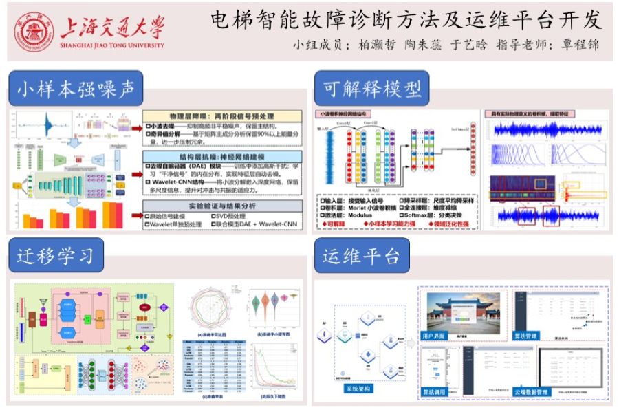 小样本及强噪声诊断方面,提出基于过采样与迁移注意力机制的电梯小样本故障诊断与基于信号去噪与自编码融合结构的电梯强噪声故障诊断;迁移学习方面,构建融合CNN-Transformer和MMD的跨工况电梯故障迁移诊断、融合MSCNN和混合注意力机制的跨噪声电梯故障迁移诊断和基于CNN-LSTM和域对抗的跨设备电梯故障迁移诊断;可解释性方面提出基于小波散射变换的电梯故障特征提取方法、基于小波散射变换的可解释电梯故障诊断模型;运维平台方面开发基于端边协同的前后端分离电梯远程智能运维云平台和智能运维算法云端管理系统。