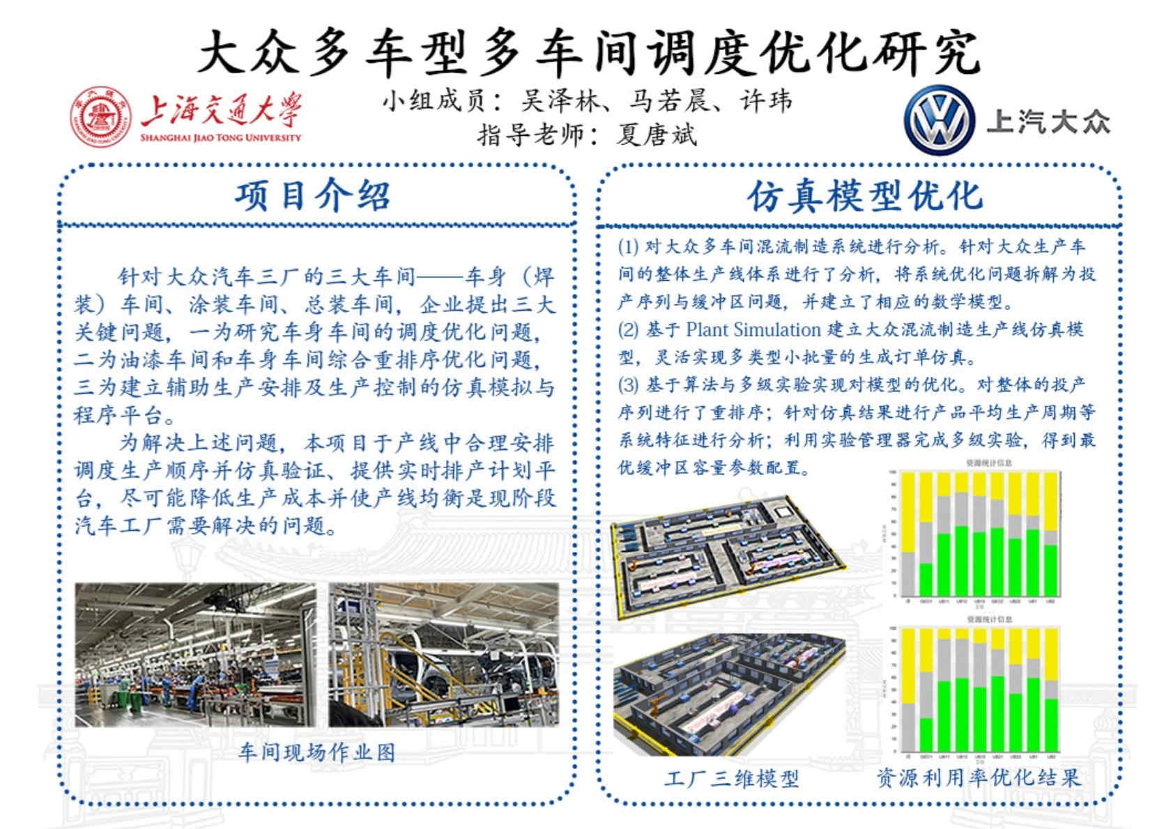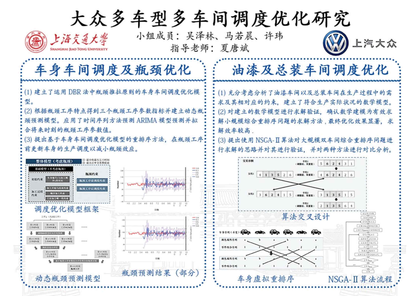 随着经济全球化,汽车企业的竞争日趋激烈,汽车制造车间必须能够灵活满足多样性的订单需求,实现以订单为牵引的精益化、柔性化生产。本项目研究对象为上汽大众安亭三厂的混合多车间加工产线,包括一个车身车间、一个油漆车间以及一个总装车间。车间与车间之间串联连接,不同车型在车间内部的加工路线提前确定,是一个大规模多车型柔性生产线。其生产路径复杂,限制条件多,对于精准的生产安排及生产控制有着迫切需求。故确立项目主题为通过建立模型、算法求解和软件仿真进行生产调度研究,提高效率,优化瓶颈;并搭建程序平台实现排产计划信息交互性的查询与调整管理。