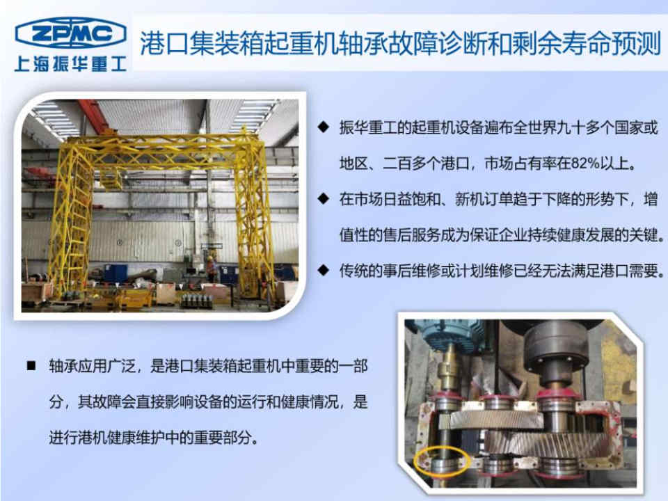 上海振华重工(集团)股份有限公司是世界港机设备最主要的供应商。在市场日益饱和、新机订单趋于下降的形势下,增值性的售后服务成为保证企业持续健康发展的关键。港口集装箱起重机突然性的未预见的故障会对港口造成不可预估的损失。传统的事后维修或计划维修已经无法满足港口需要,港口迫切需要在起重机发生故障之前,根据起重机当前的状态预测到未来可能的故障并在故障发生之前安排维护作业。本项目构建了港口集装箱起重机轴承的故障诊断和剩余寿命预测平台,辅助港机的维护。