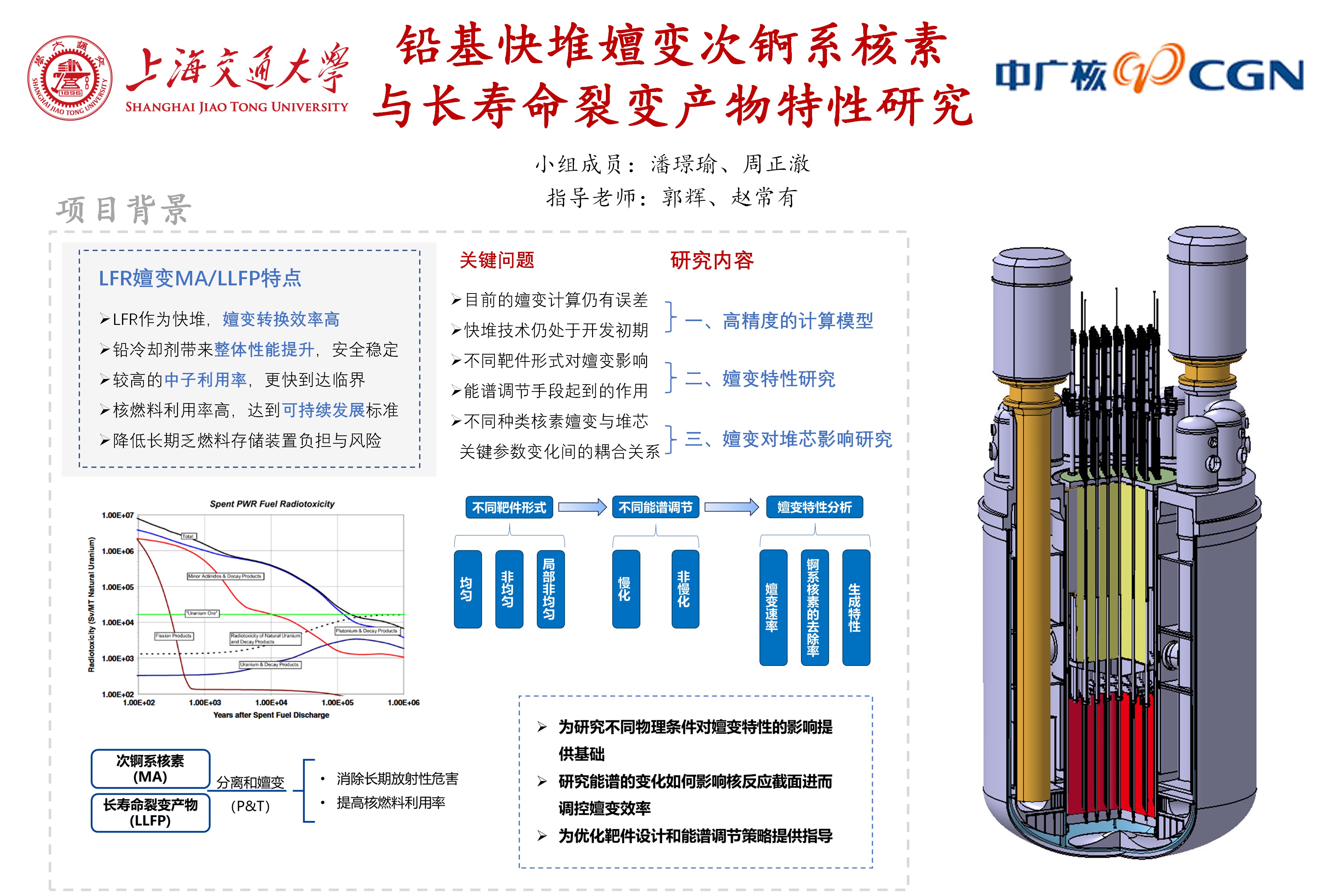 核能以其高效、清洁的特点成为重要的能源选择,但乏燃料中高放射性废物(次锕系核素MA和长寿命裂变产物LLFP)的长期危害是其广泛应用的主要障碍。铅基快堆作为第四代核能系统的核心堆型之一,不仅具有优异的本征安全性和燃料利用率,还能够通过嬗变技术减少高放废物,降低长期辐射危害,提升核燃料循环效率。因此,本项目聚焦于铅基快堆中的MA和LLFP嬗变特性及其对堆芯性能的影响,研究不同靶件形式、慢化与非慢化调节策略及嬗变过程对堆芯整体性能的复杂耦合作用。