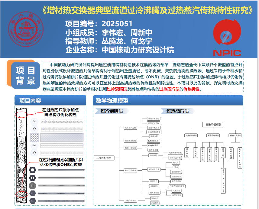 中国核动力研究设计院提出通过使用增材制造技术在换热器内部单一流动管道全长中兼顾各个流型的特点针对性分段式设计流道的几何结构有利于制造出重量更轻、成本更低、复杂度更高的换热器。通过采用于单相水和过冷沸腾段添加肋片以促进传热并且优化过冷沸腾起始点(ONB)的位置、于过热蒸汽段添加点阵结构以优化传热困难区的传热效果的方式可以在整体上提高换热器的传热性能和稳定性。本项目以此为背景,探究增材热交换器典型流道中具有肋片的单相水段和过冷沸腾段及具有点阵结构的过热蒸汽段的传热特性。
