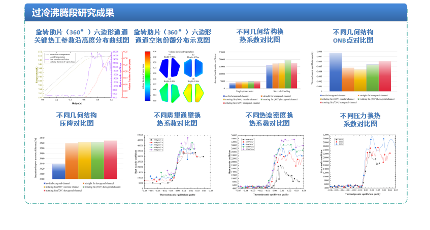 在增材热交换器典型流道过冷沸腾传热特性研究中,分析无肋片六边形通道、直肋片六边形通道、旋转肋片(360°)六边形通道、旋转肋片(720°)六边形通道和旋转肋片(360°)圆形通道的流动特性和传热特性,并且探究几何结构、压力、热流密度和质量通量对于流动传热特性的影响与作用机理。在增材热交换器典型流道过热蒸汽传热特性研究中,分析带有多种类型点阵的六边形通道的流动特性和传热特性。并且探究几何结构和关键热工参数对于流动传热特性的影响与作用机理。