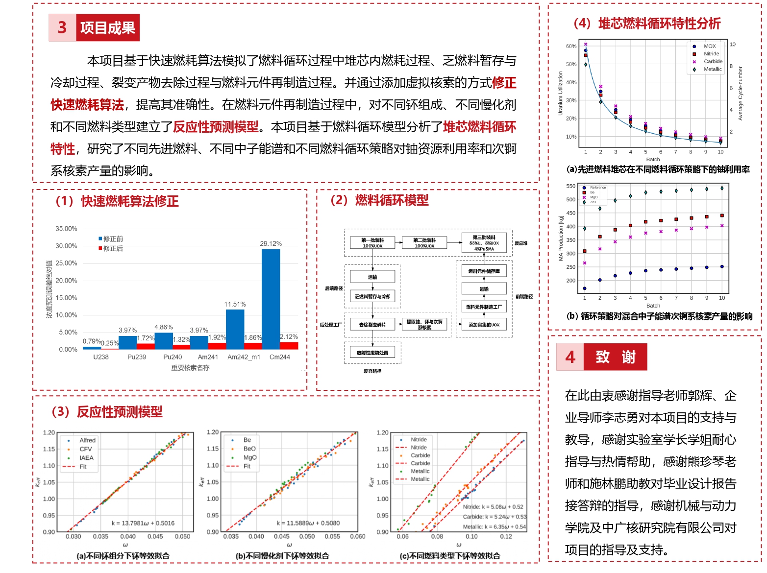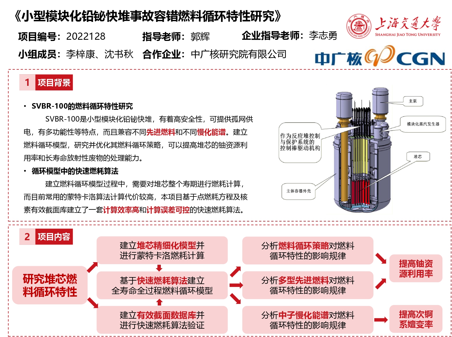 本课题取得了以下成果:小型铅铋快堆燃料循环特性调研、基于蒙特卡罗程序OpenMC的SVBR-100堆芯精细化模型、基于堆芯快速燃耗计算方法的SVBR-100全寿期燃料循环特性模型、SVBR-100先进燃料循环策略分析、多型先进燃料循环特性分析。本课题的研究成果,将为SVBR-100提供技术参考,为优化小型铅铋快堆燃料循环策略提供依据,有利于提高小型铅铋快堆燃料循环对核燃料的利用率,以及对次锕系核素的嬗变能力,从而提升SVBR-100技术的经济性和清洁性,增强该技术的市场竞争力。