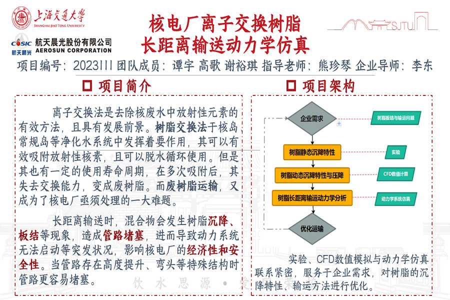 离子交换法是去除核废水中放射性元素的有效方法,且具有发展前景。树脂交换法于核岛、常规岛等净化水系统中发挥着要作用,其可以有效吸附放射性核素,且可以脱水循环使用。但是其也有一定的使用寿命周期,在多次吸附后失去交换能力变成废树脂。而废树脂运输,又成为了核电厂亟须处理的一大难题。长距离输送时,混合物会发生树脂沉降、板结等现象,造成管路堵塞,进而导致动力系统无法启动等突发状况,影响核电厂的经济性和安全性。当管路存在高度提升、弯头等特殊结构时管路更容易堵塞。本项目从实验、CFD模拟、动力学仿真三部分出发,对树脂长距离输送进行优化。