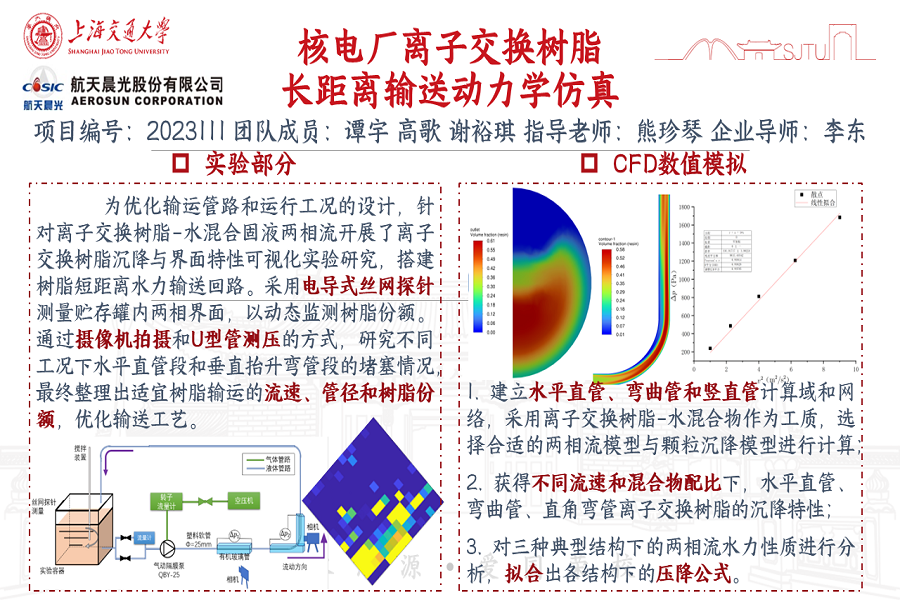 其一,在静置容器和水力输运回路中开展沉降实验研究,获得不同配比下树脂沉降板结特性。其二,进行典型结构下树脂沉降 CFD 数值模拟研究,获得不同速度和配比下树脂压降和沉降特性,获得阻力关系式。其三,长距离输送开展动力学仿真及试验验证,结合电厂的运用场景,建立长距离输送动力学系统仿真模型,优化其配置,并进行试验数据验证。