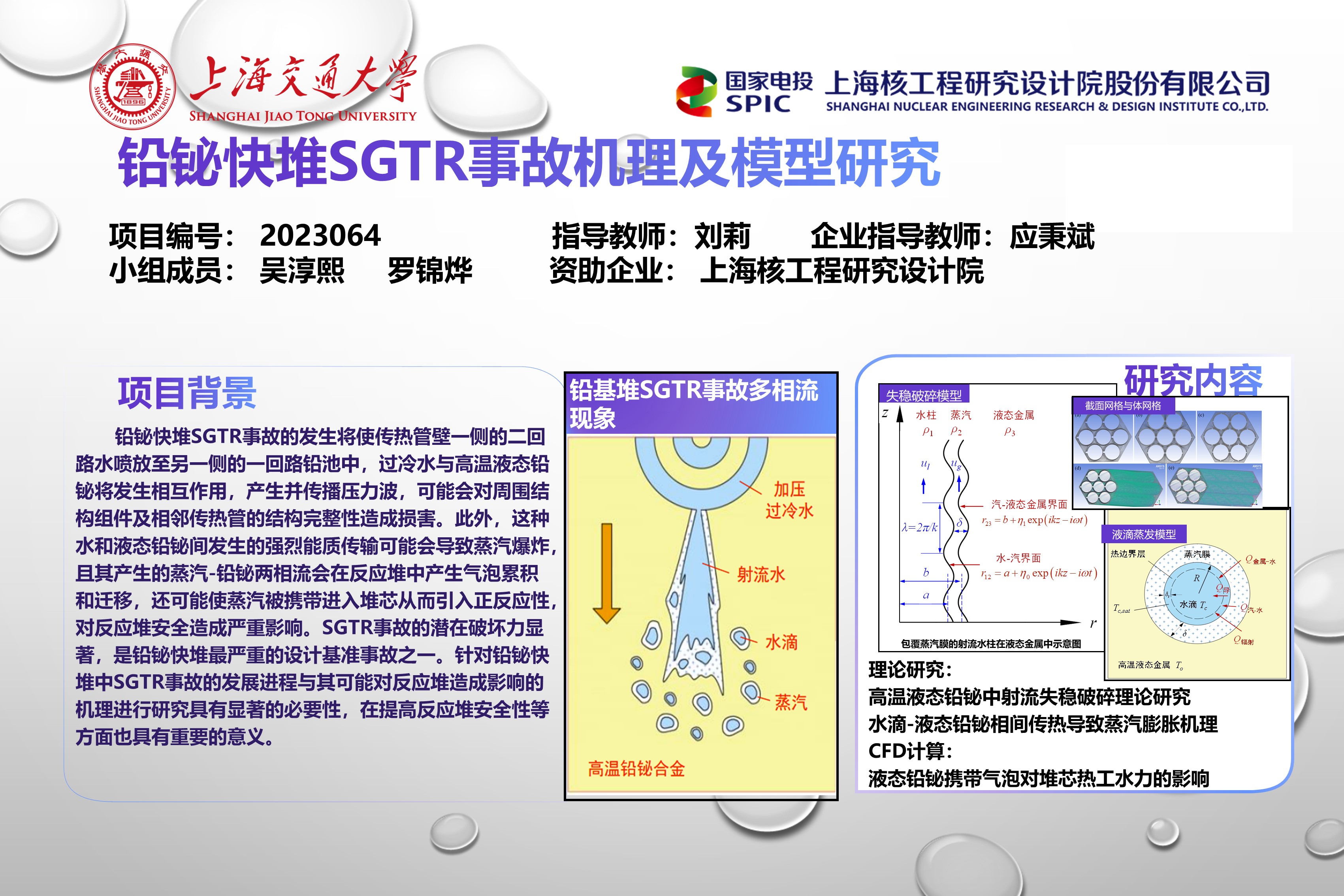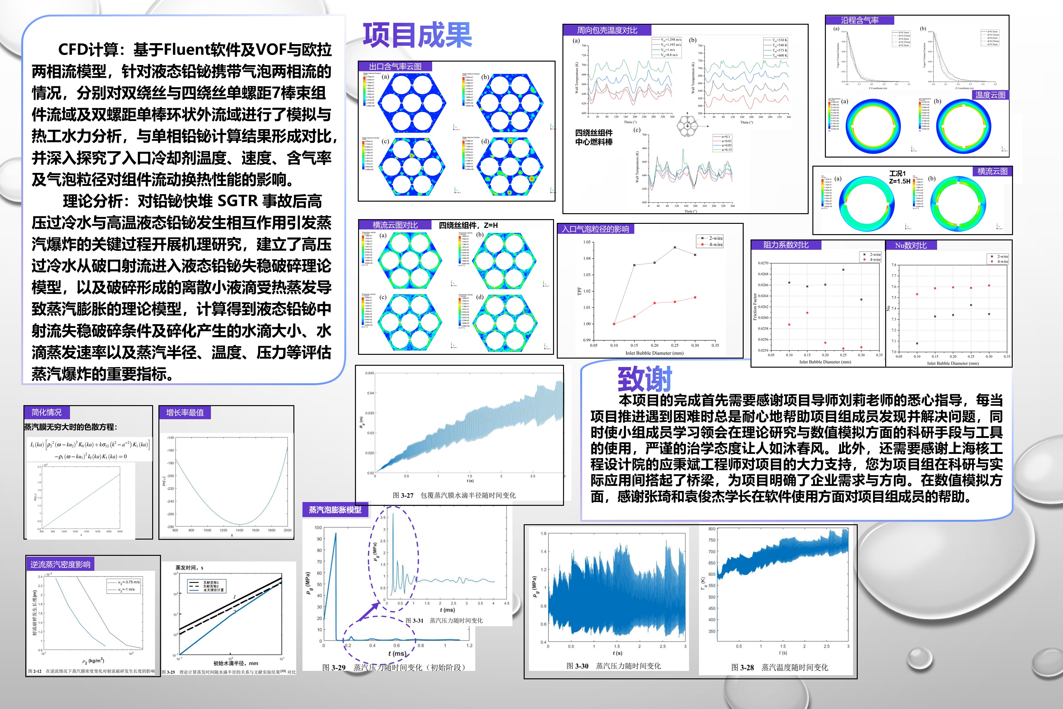 本毕设项目名称为“铅铋快堆SGTR事故机理及模型研究”,项目分别通过理论分析与数值模拟的方法对铅铋快堆SGTR事故后过冷水与高温液态铅铋发生相互作用引发蒸汽爆炸以及蒸汽泡随液态铅铋迁移进入堆芯两方面后果展开研究分析,以获得过冷水-液态铅铋相间传热模型及蒸汽爆炸机理与液态铅铋中气泡携带对堆芯带绕丝燃料组件热工水力性能的影响机理。项目获得的理论和数值模型能够为目前铅基快堆安全分析提供参考,具有一定的现实意义。