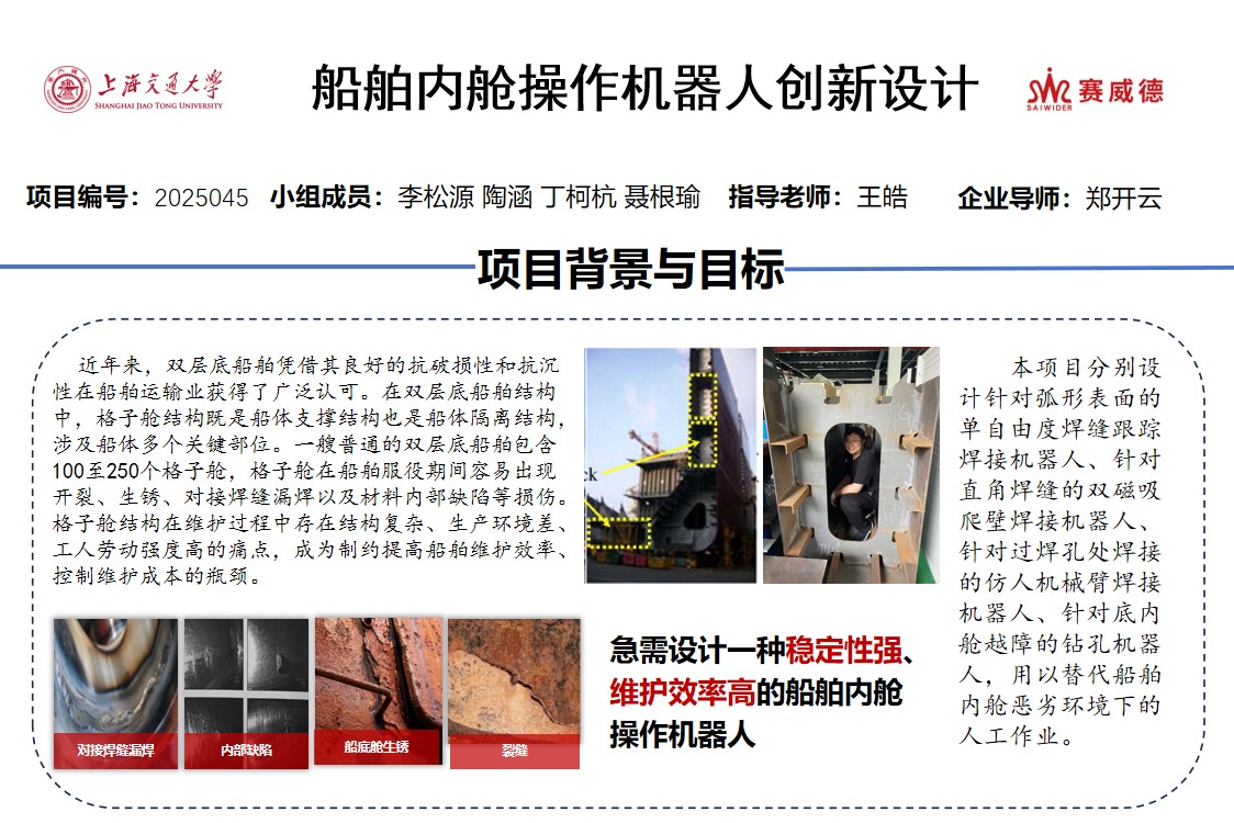 本项目旨在项目组中的每个成员根据不同的焊接场景分别设计针对弧形表面的单自由度焊缝跟踪焊接机器人、针对直角焊缝的双磁吸爬壁焊接机器人、针对过焊孔处焊接的仿人机械臂焊接机器人、针对底内舱越障的钻孔机器人,用以替代船舶内舱恶劣环境下的人工作业。这些机器人相较于传统人工作业,既节省了人力成本,效率也显著提升,工作过程的安全性也能得到保障,对维护船舶结构的稳定性具有重要作用。