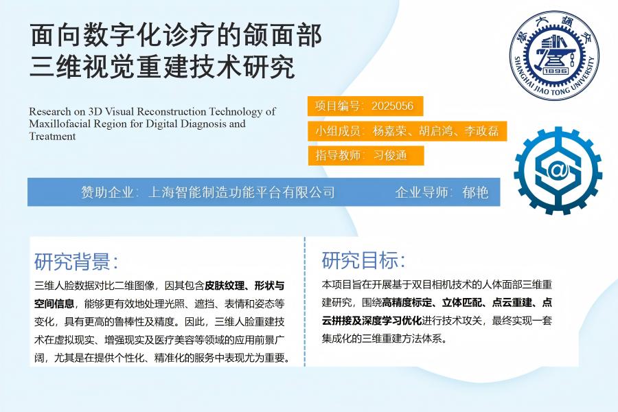 三维人脸数据对比二维图像,因其包含皮肤纹理、形状与空间信息,能够更有效地处理光照、遮挡、表情和姿态等变化,具有更高的鲁棒性及精度,因此三维人脸重建技术在虚拟现实、增强现实及医疗美容等领域的应用前景广阔。本项目旨在开展基于双目相机技术的人体面部三维重建研究,围绕双目相机高精度标定、立体匹配、人脸点云重建、人脸点云拼接及深度学习优化进行技术攻关,最终实现一套集成化的三维重建方法体系。通过该体系的开发与优化,提升面部重建精度与效率,为人脸识别、虚拟现实、医疗美容等领域提供技术支持。