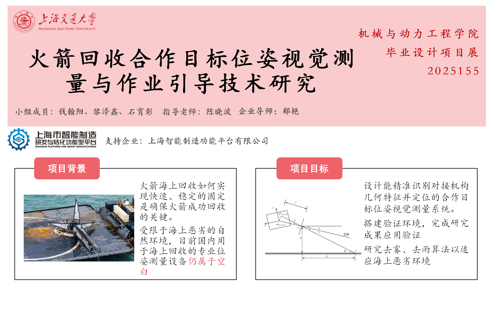 火箭海上回收相较于陆上回收有更大的运力和经济优势,我国也计划于今年实现可重复使用火箭的首飞。但由于海上风浪大,回收船颠簸,且火箭助推器重心高易倾倒,因此实现快速、稳定的固定是确保火箭成功回收的关键。而海上恶劣的环境,如多雾、多雨等,都对传统的测量方式提出了挑战,目前国内并没有一套成熟的助推器固定系统。因此,本项目旨在实现对助推器上对接机构的快速准确识别,引导AGV机器人进行固定作业。