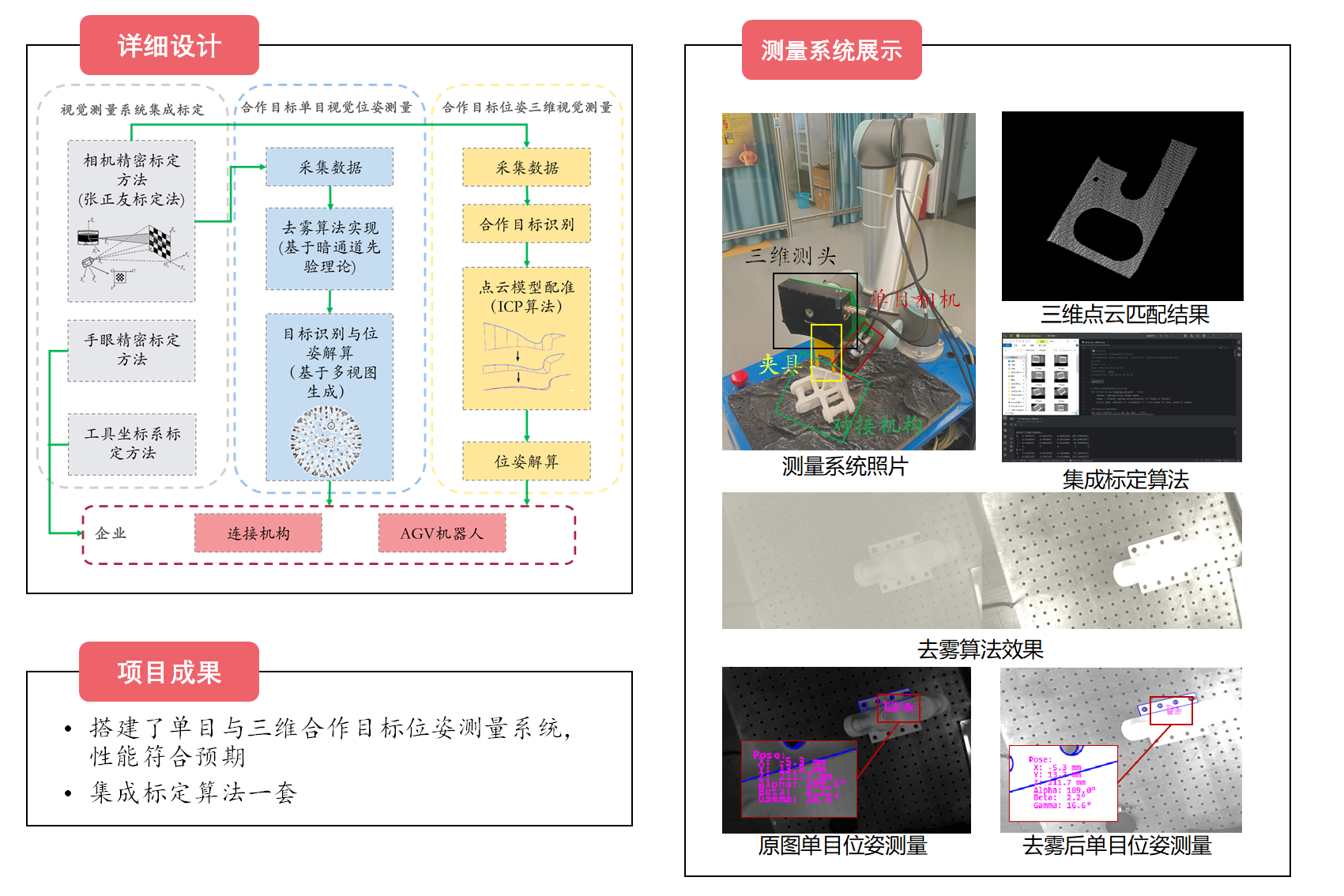 项目提出了单目与三维测量两种视觉路线进行合作目标的位姿测量,并利用集成标定的方法实现了视觉系统精密标定与手眼和工具坐标系的标定,为AGV机器人的固定作业实现了引导功能。同时,本项目还设计出了一套视觉测量与作业引导样机系统对模型进行了测量与验证,实现了毫秒级的稳定测量。此外,还针对多雾情况研究算法进行去雾,保证了在恶劣的环境、多噪声情况下系统的稳定性。