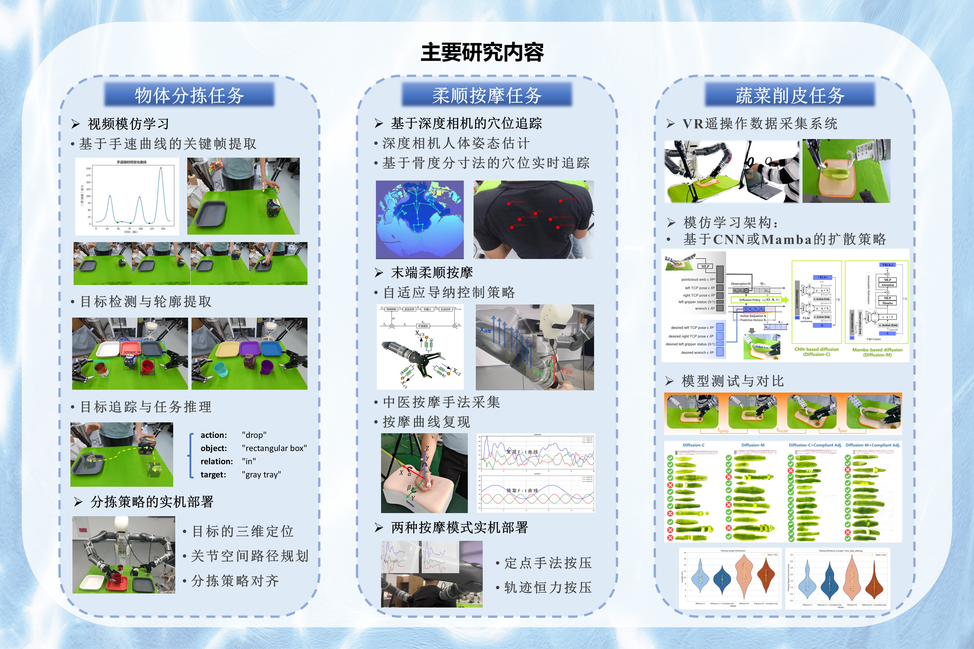 项目已完成仿人双臂机器人平台的软硬件搭建与系统集成,具备视觉识别、语义感知、力控执行等多模态能力,支持多类任务的灵活切换。在任务层面,成功实现了基于视频模仿学习的物体分拣、基于力觉感知的柔顺按摩,以及面向复杂接触操作的蔬菜削皮三项典型任务。项目同时验证了融合多模态感知与调节策略的控制方法,显著提升了机器人对动态场景和任务变化的适应能力。相关成果为后续更完整的具身智能框架研究和思路探索奠定了坚实基础。