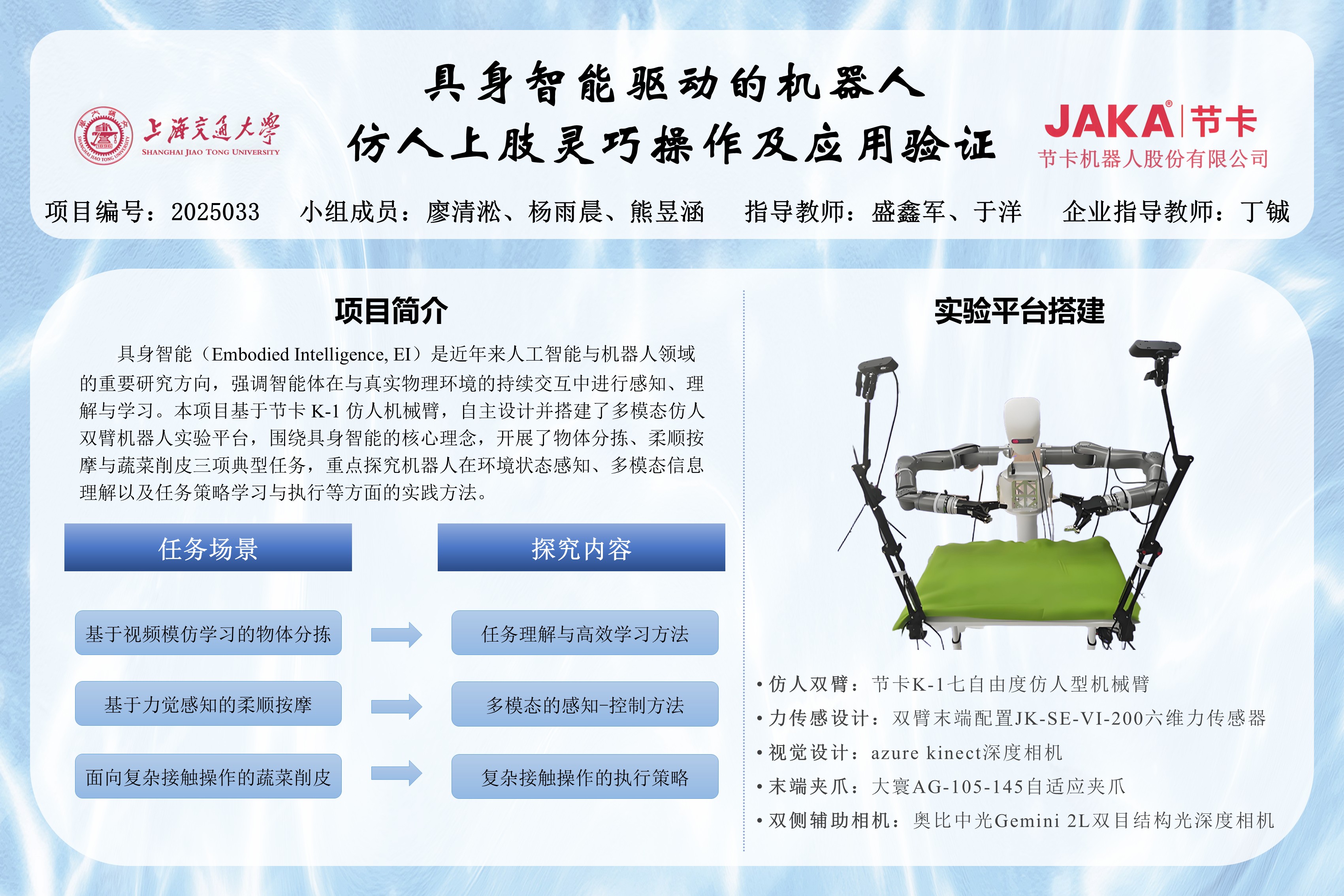 具身智能是近年来人工智能与机器人领域的重要研究方向,强调智能体在与真实物理环境的持续交互中进行感知、理解与学习。本项目基于节卡 K-1 仿人机械臂,自主设计并搭建了多模态仿人双臂机器人实验平台,围绕具身智能的核心理念,开展了物体分拣、柔顺按摩与蔬菜削皮三项典型任务,重点探究机器人在环境状态感知、多模态信息理解以及任务策略学习与执行等方面的实践方法。