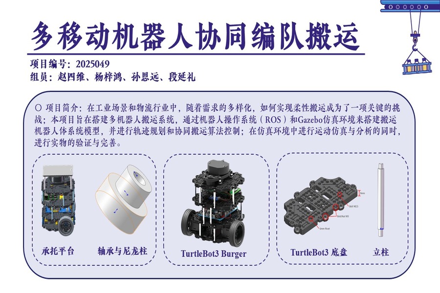 在现代工业场景中,多机器人协同搬运系统展现出广泛的应用潜力。本项目基于校企合作背景,根据飒智公司提供的设想,结合仿真环境与实际场景实验,设计搭建了一套高效、稳定、可扩展的多机器人协同搬运系统。该系统采用TurtleBot3 Burger作为驱动机器人,装载可旋转式承托结构,配合环境感知与高精度建图和定位算法、多机器人互定位算法、路径规划导航算法、协同编队控制算法,能在搬运过程中通过双轮差速驱动实现整体的平动、旋转、避障等功能。
