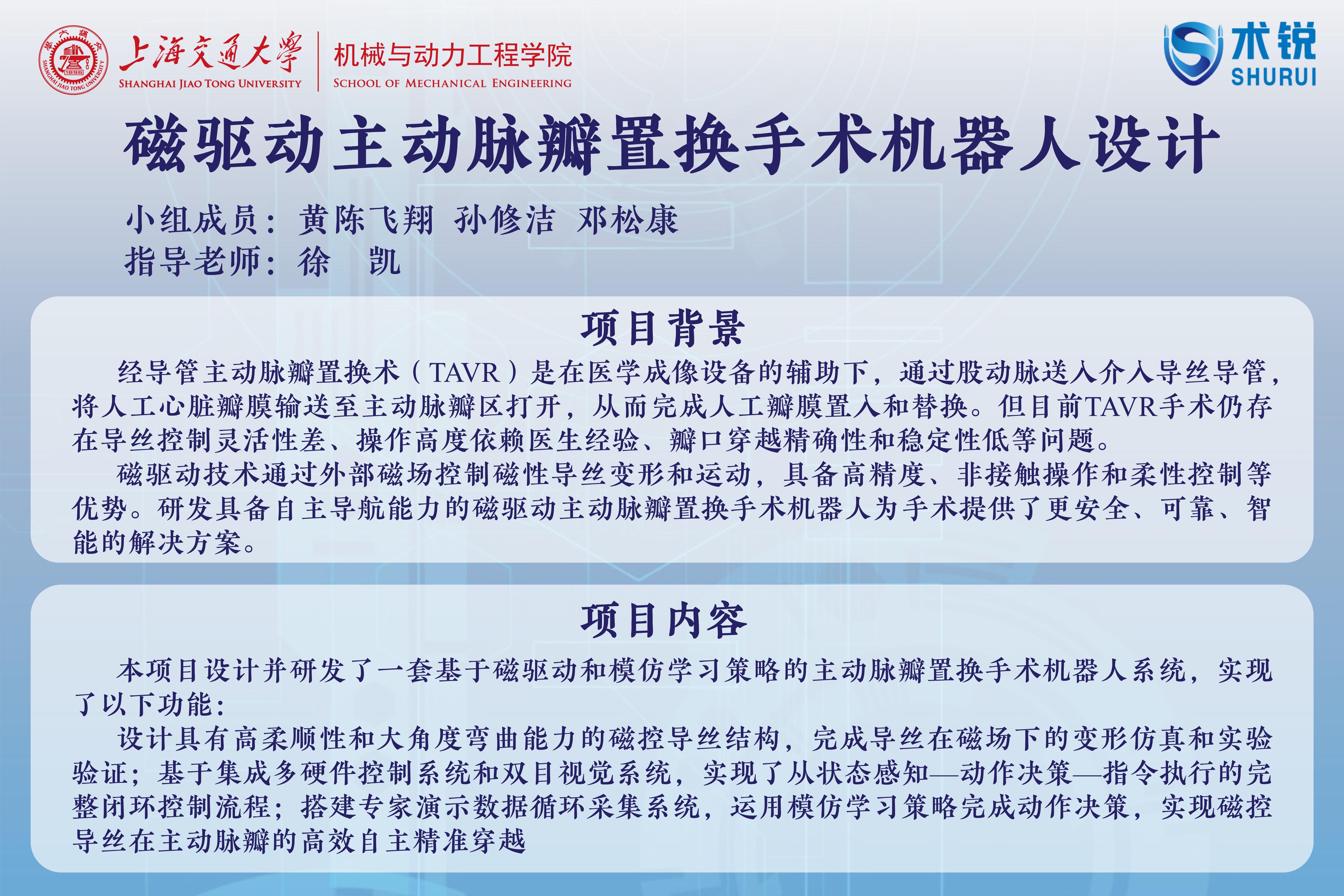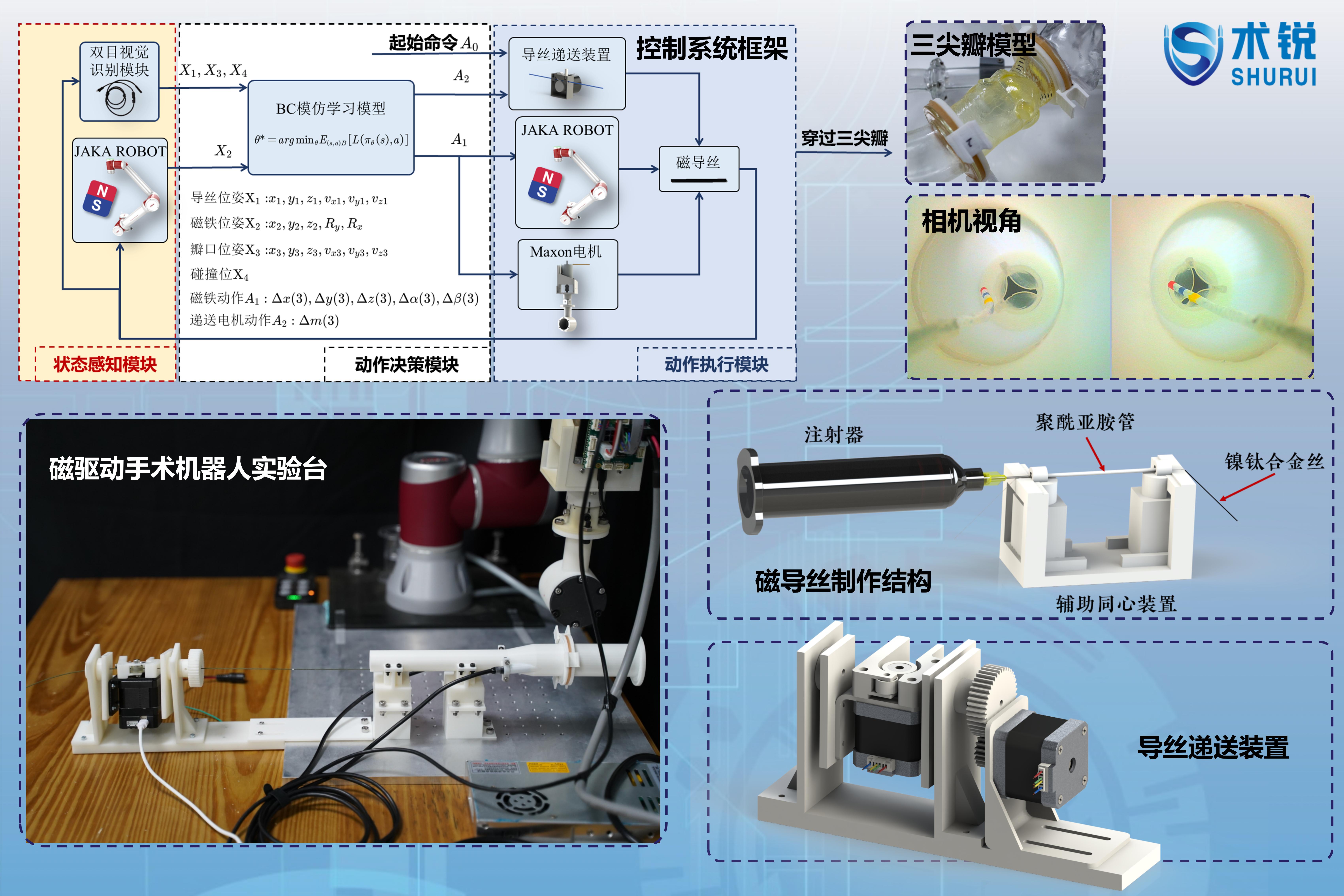 本项目针对经导管主动脉瓣置换术(TAVR)中导丝控制灵活性较差、瓣口穿越困难等问题,设计并研发了一套基于磁驱动和模仿学习的主动脉瓣置换手术机器人系统。系统通过机械臂控制永磁铁和驱动电机实现导丝的可控运动,基于双目视觉系统实现对导丝尖端和主动脉瓣口的识别和定位,完成了从状态感知—动作决策—指令执行的完整闭环控制流程设计和搭建。系统采用模仿学习策略,基于专家演示数据完成动作策略学习,最终实现了磁控导丝对主动脉瓣口的自主精准穿越,为智能化、高鲁棒性的TAVR手术提供了系统性技术解决方案。