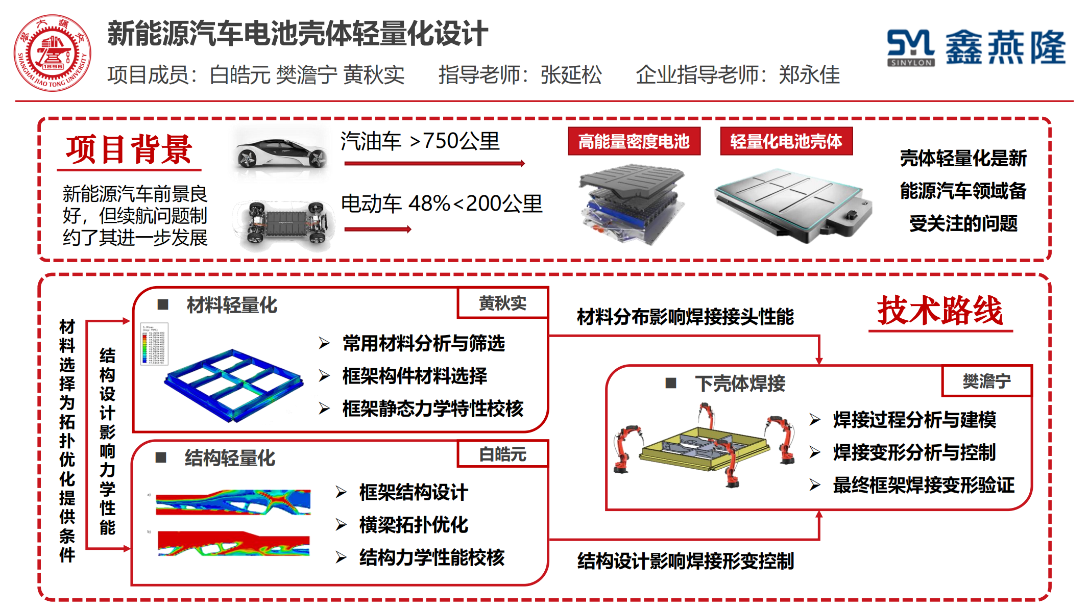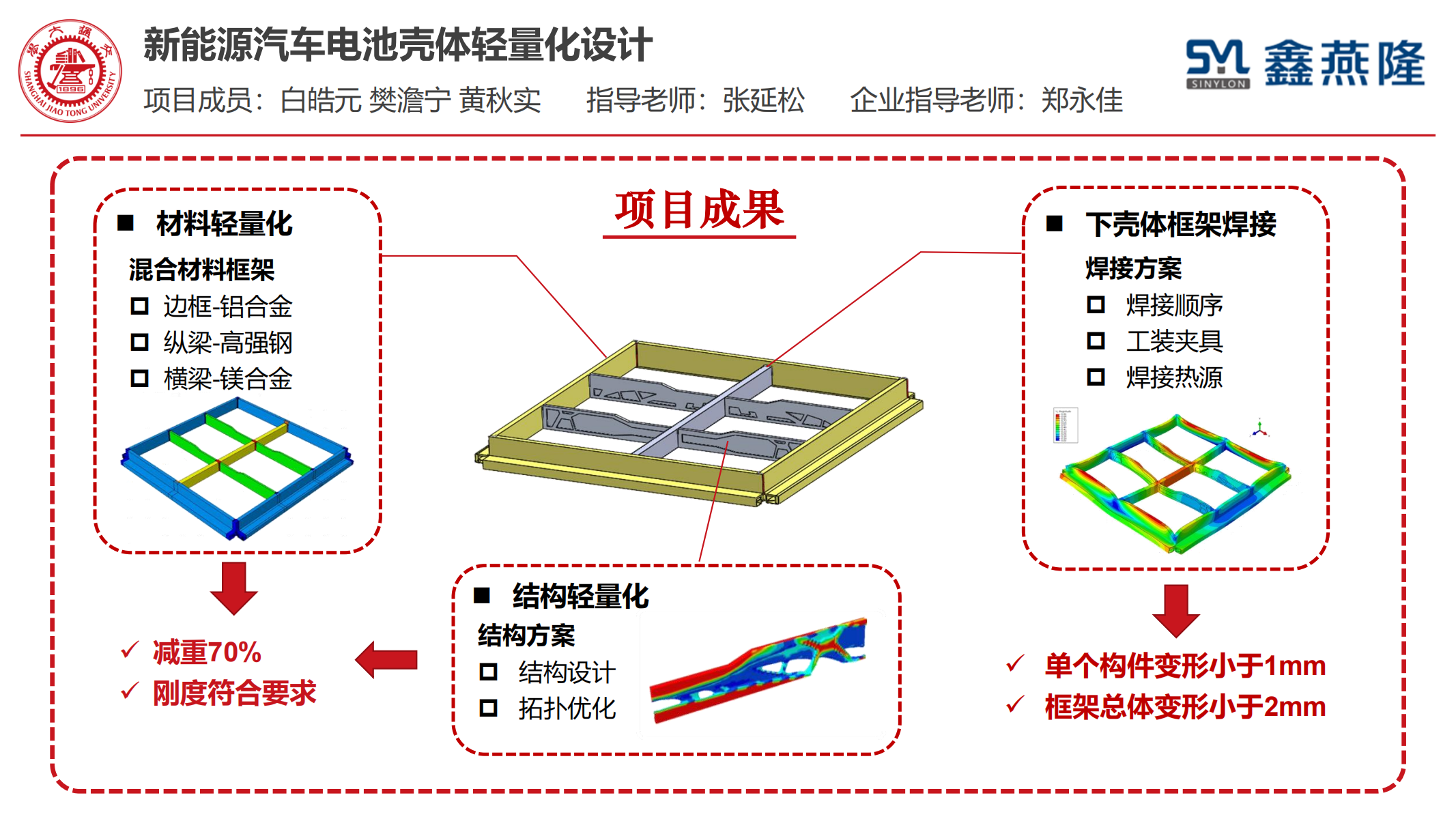 项目完成了材料、结构、焊接方案的设计,得到强度符合要求,焊接变形小于2mm的电池下壳体框架设计方案,实现68%的减重效果。基于框架结构,给出了符合强度要求的镁合金、铝合金、高强钢混合材料方案,并利用拓扑优化算法重设计了横梁结构,根据焊接过程建立了焊接仿真模型,给出了焊接方案。