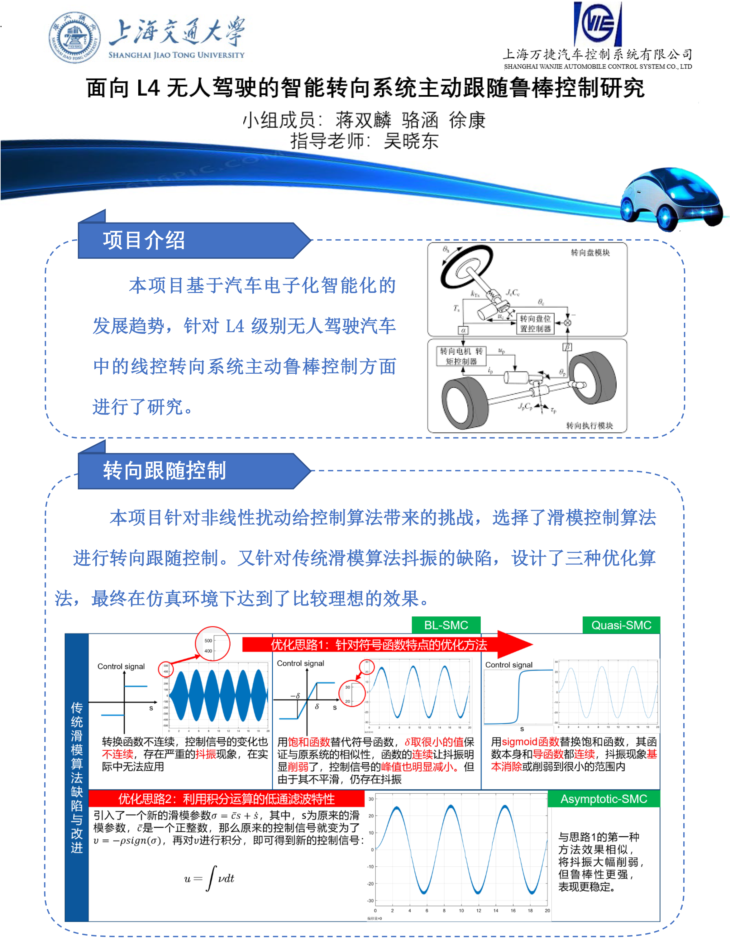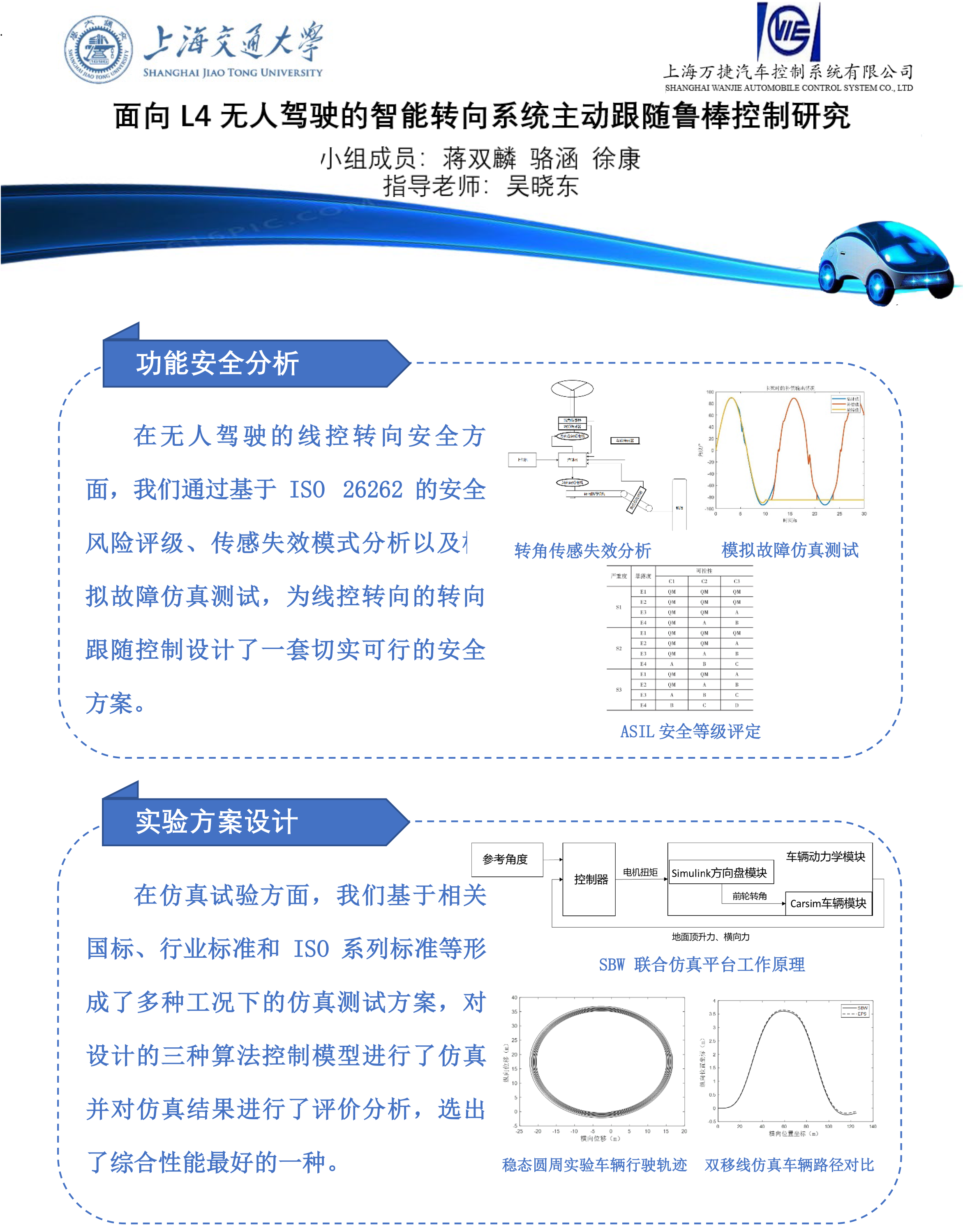 在整个项目中,我们分别进行了转向跟随算法设计、功能安全设计、以及仿真实验验证三个方面的工作。设计了三种基于滑模理论的转向跟随算法,并进行了横向比较;功能安全部分进行了基于ASIL等级的功能安全分析和容错补偿设计。最后参考多种测试标准,设计了仿真验证实验方案,进行了软件联合仿真。整个研究过程从理论研究到具体设计,再到仿真验证,层层递进,最终形成我们的研究成果。最终能够实现较好的转向跟随效果,基本满足了客户需求。