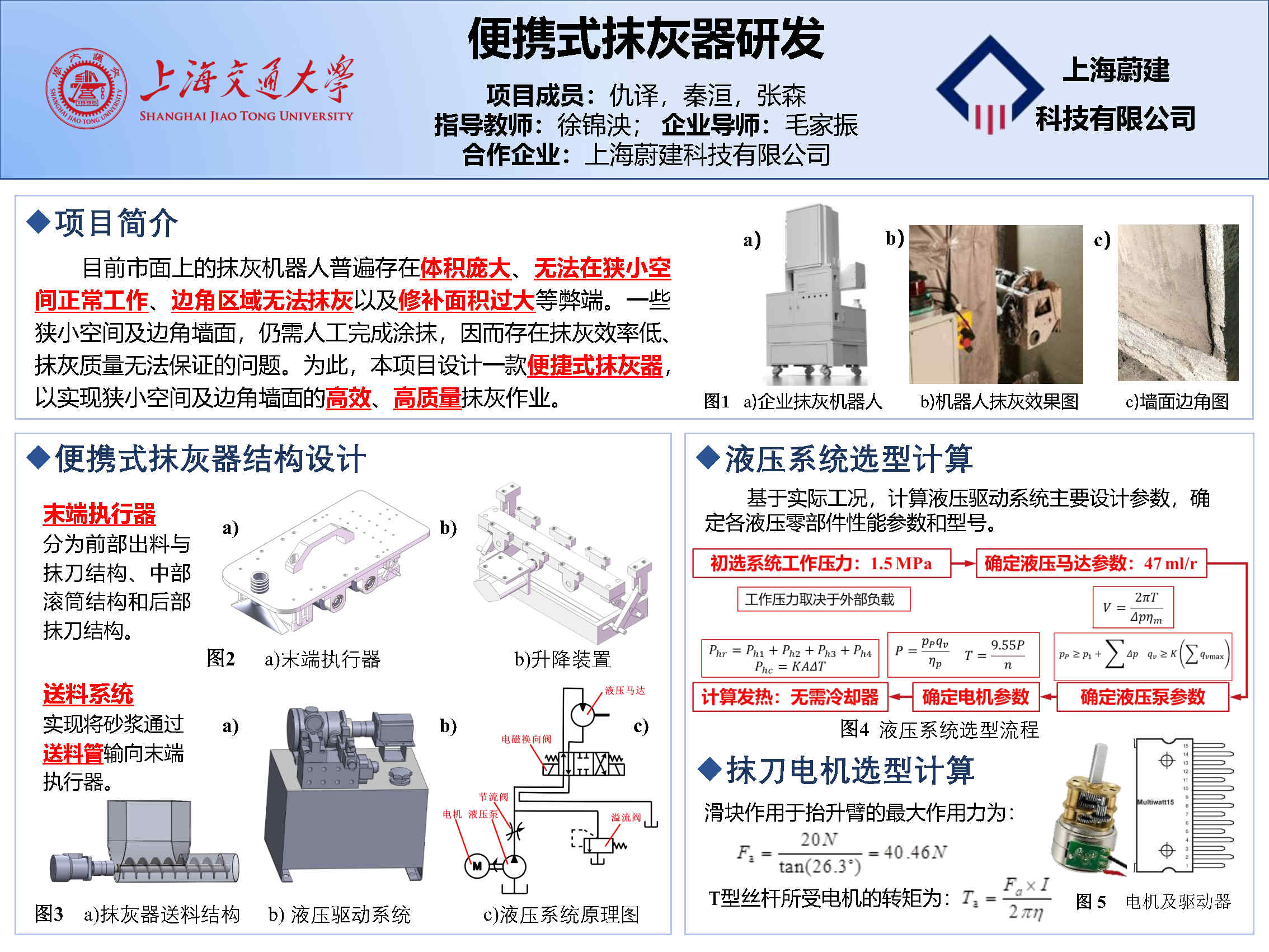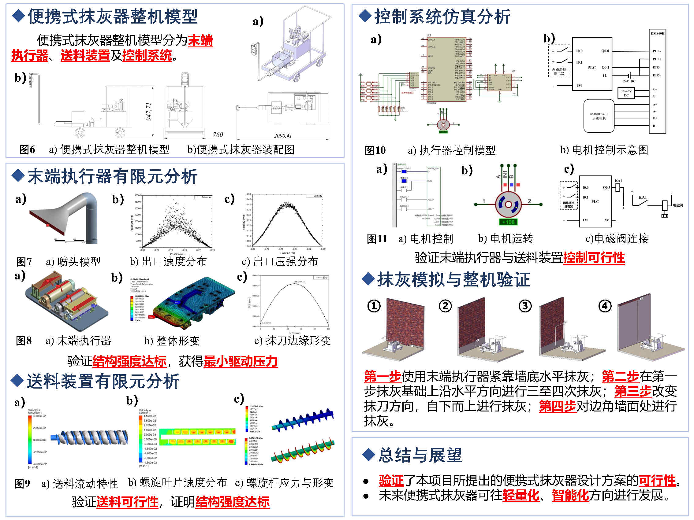 对便携式抹灰器的研究现状进行调研,完成质量需求分析。完成末端执行器的零件设计,可制造性及可装配性分析;完成送料装置的原理设计,零件选型及装配设计;完成抹灰器控制系统硬件选型,程序设计及送料控制箱设计。对末端执行器进行抹刀控制仿真,完成送料控制系统模拟验证,验证控制程序和接线方式的合理性;对末端执行器进行送料管混凝土流动仿真、前抹刀形变仿真及末端执行器整机形变仿真,完成最大形变校核;对送料装置进行流体仿真、流固耦合仿真,验证送料功能及校核强度。最后完成便携式抹灰器抹灰流程模拟,验证整体设计方案可行性。