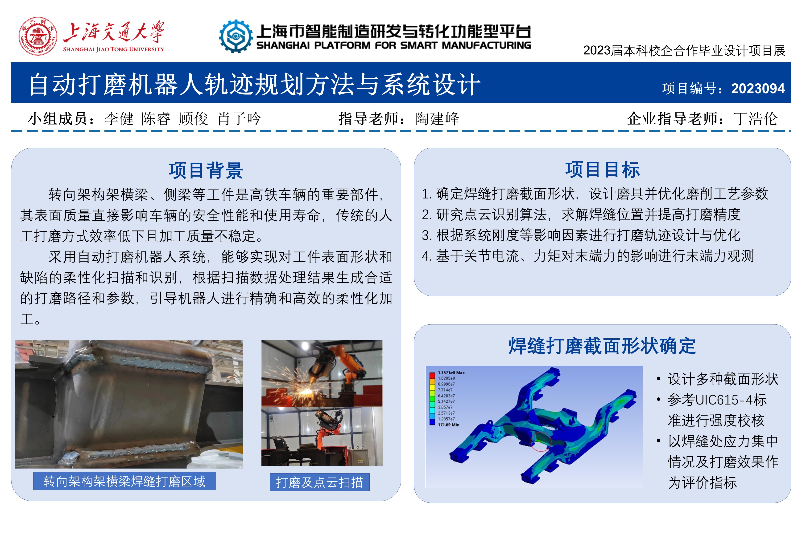 本项目主要目标在于对机器人打磨焊缝过程进行优化,缩短加工节拍、提高打磨精度。项目主要分为以下四个部分展开。