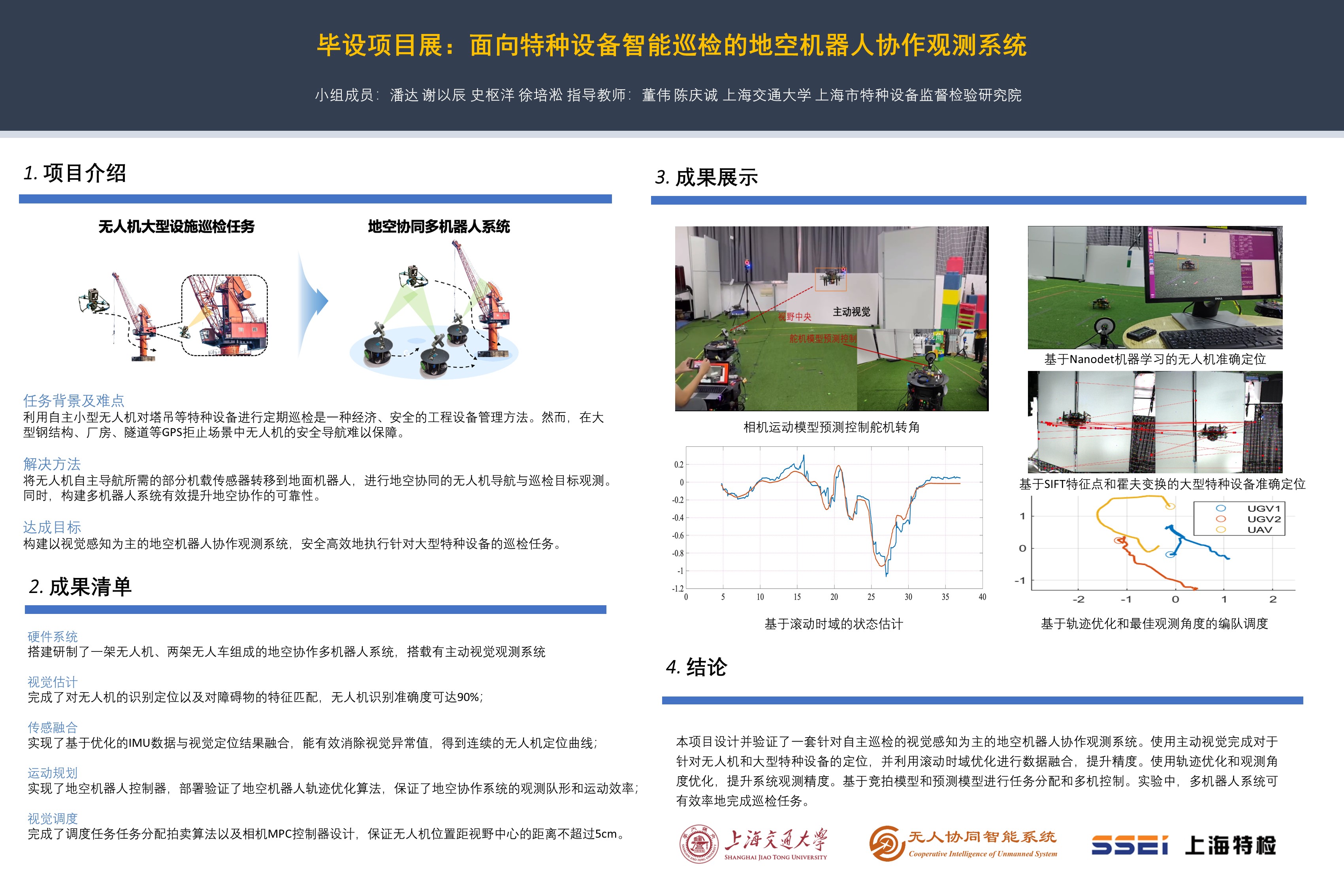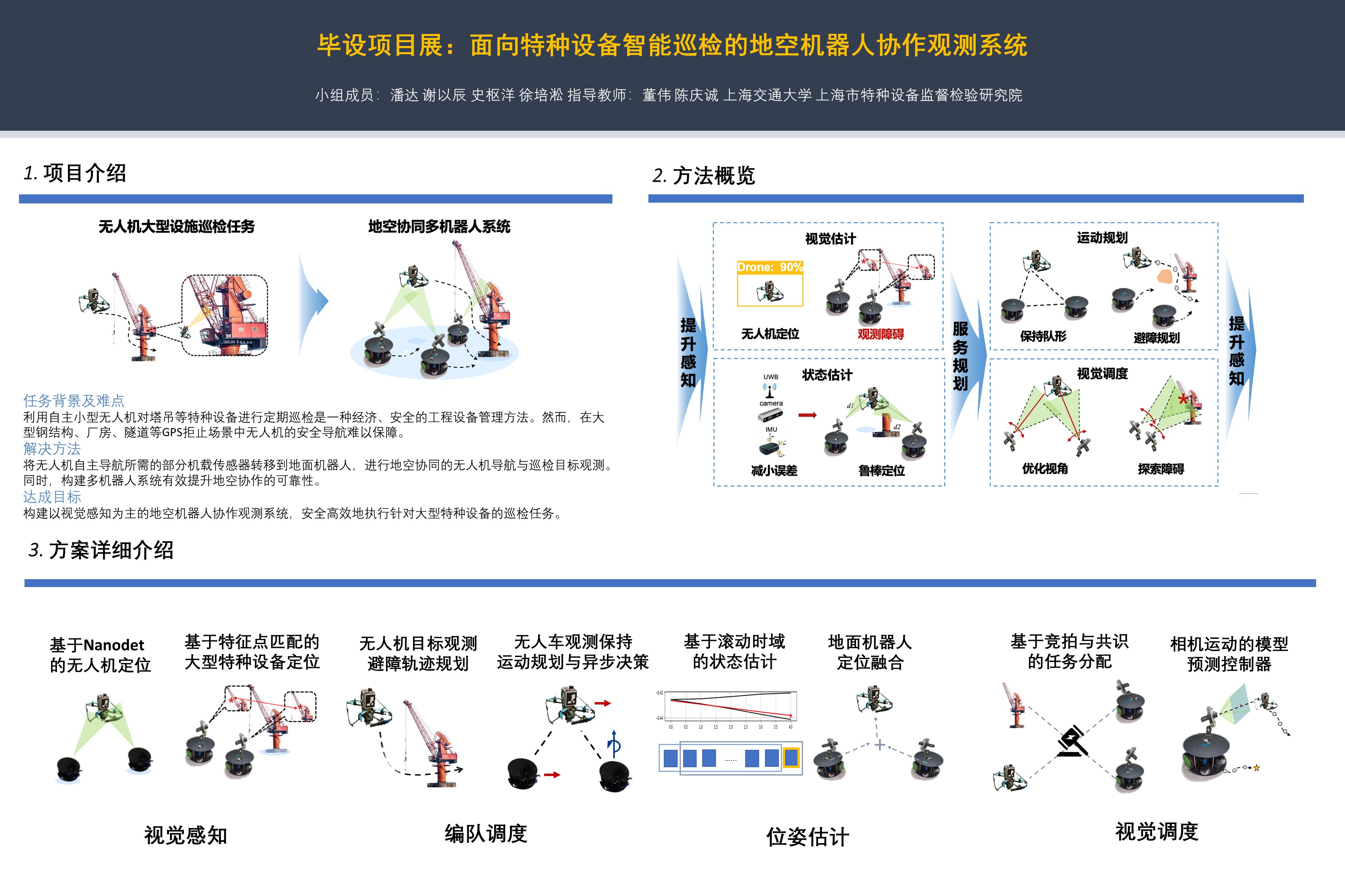 搭建研制了一架无人机、两架无人车组成的地空协作多机器人系统;并且完成了视觉估计、传感融合、运动规划、视觉调度软硬件设计。