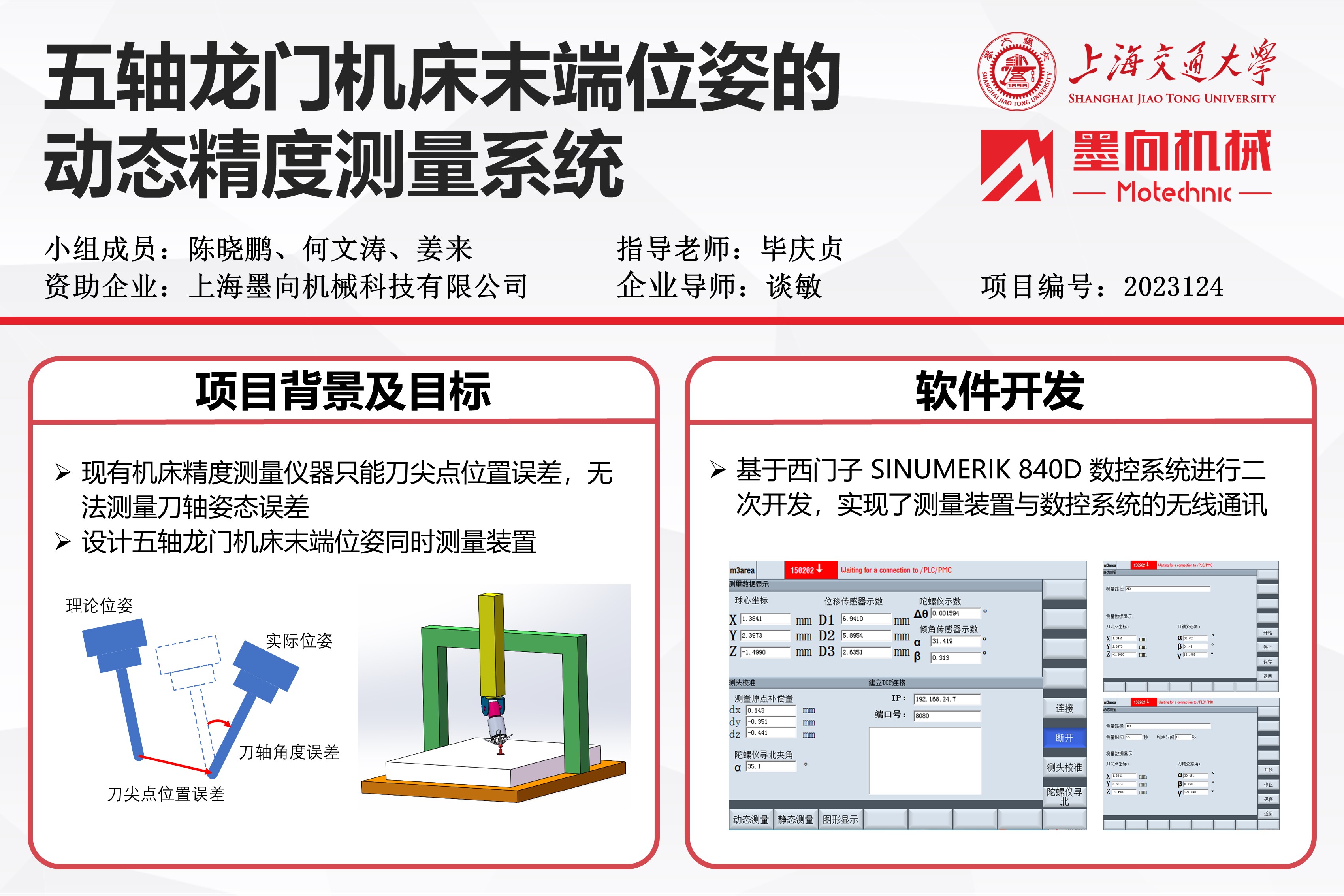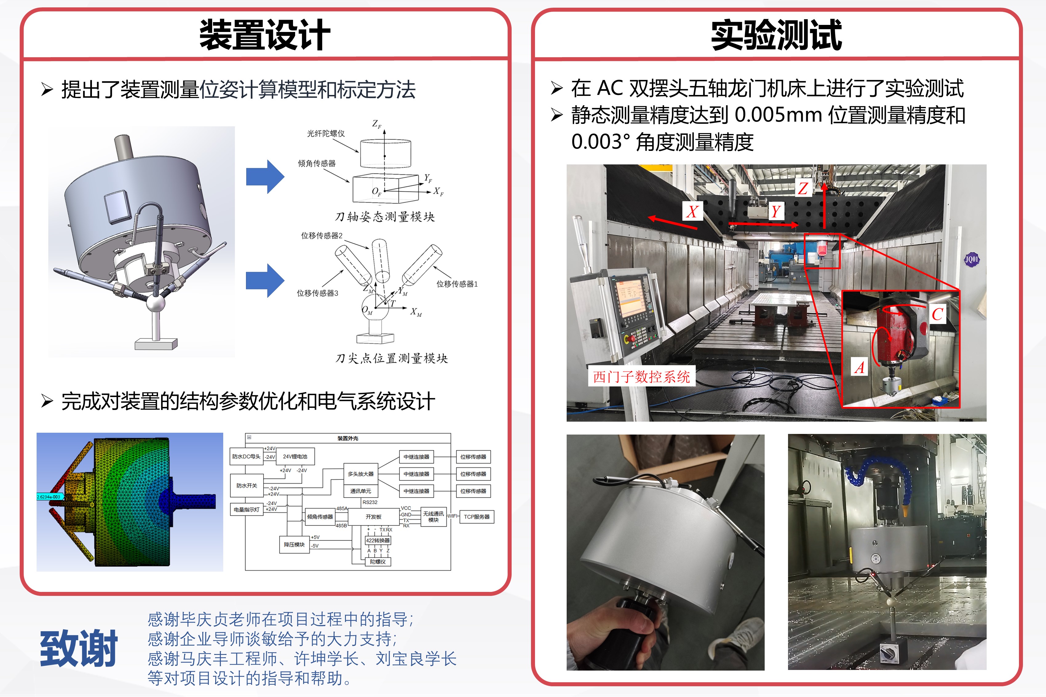 设计一种刀尖点位置误差和刀轴姿态误差同时测量装置,包括装置的电气系统设计,结构设计及结构参数优化,测量原理设计,装置标定方法,数控系统软件二次开发等,实现0.005mm位置测量精度和0.003°角度测量精度的技术指标。此外,还要对五轴机床的误差进行分析和评估,包括机床旋转轴位置无关误差的辨识方法,机床运动误差综合测评方法,机床空间误差和伺服控制误差的补偿方法等。