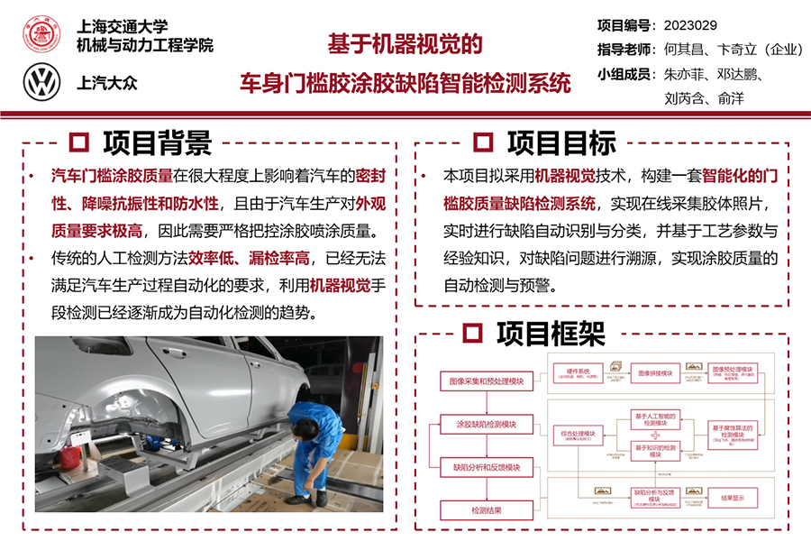 本项目研究对象主要为汽车门槛胶,目的是对汽车门槛涂胶检测环节搭建一套完整的智能化的门槛胶质量缺陷检测系统,解决实际生产中人工检测涂胶质量检测效率低的问题。通过结合传统视觉算法与人工智能方法,使用机器视觉技术对各类不同的涂胶缺陷进行分类与检测,并对涂胶过程中的各项质量检测指标进行检测以完成缺陷分析与反馈,达成检测系统的闭环。