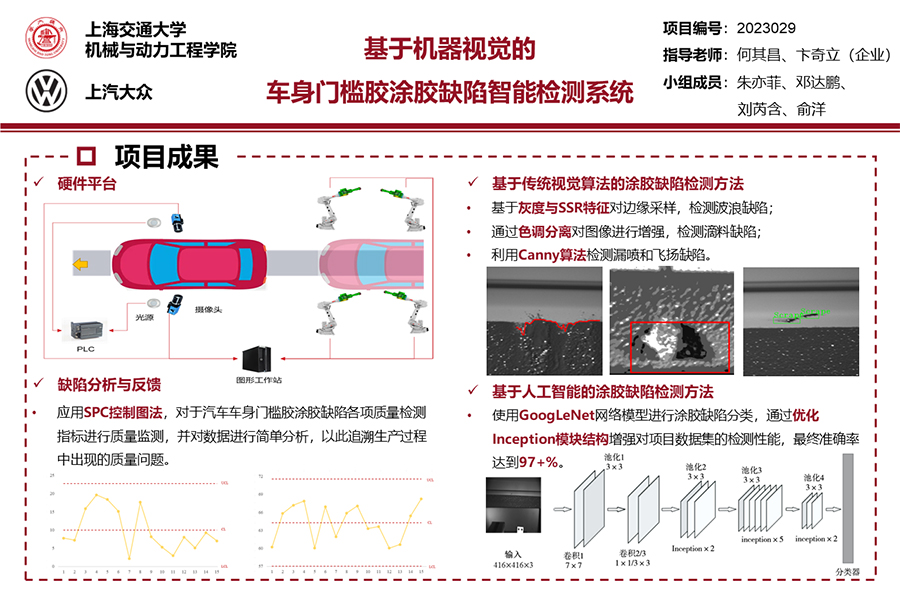 成功构建一套智能化的门槛胶质量缺陷检测系统:采用传统视觉算法缺陷检测,成功对区域性缺陷(包括漏喷、飞扬、刮蹭等),波浪、滴料等缺陷类型进行检测。基于深度学习神经网络对涂胶缺陷进行分类,实现对涂胶缺陷数据集的有效检测,准确率达到97+%。应用SPC控制图法,对车身门槛涂胶缺陷各项质量检测指标进行检测,用于追溯生产过程中出现的质量问题。并针对此智能检测系统设计对应的程序界面,使各处理环节可视化。
