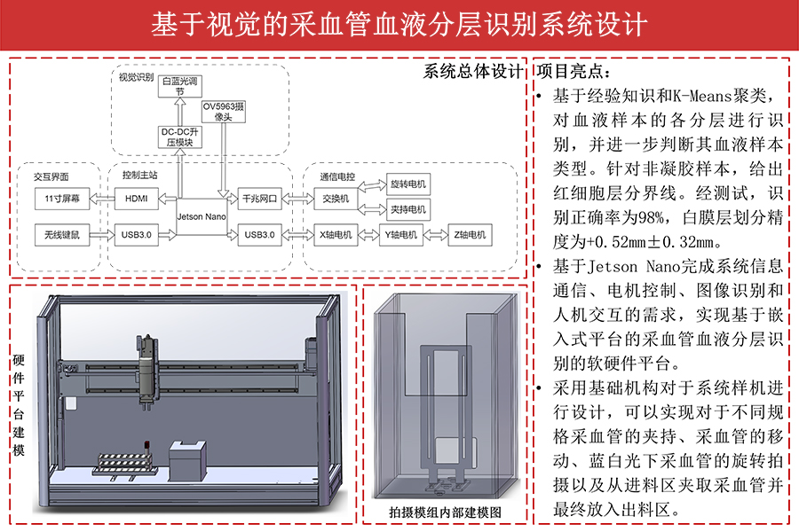 本项目计划开发一套高通用性的机器视觉软硬件平台,用以实现多场景下的血管血液样本分类和分层识别任务。该平台可服务于医疗机构、实验室等检测场景,提高样本检测效率、降低人工错误,实现可靠的样本分类和分层识别。本项目由三个主要部分组成:样本检测硬件平台;嵌入式系统及交互模块;视觉识别模块。计划在嵌入式平台上实现图片在线标注和检测结果评估等功能,并提供具有良好交互性的用户界面。