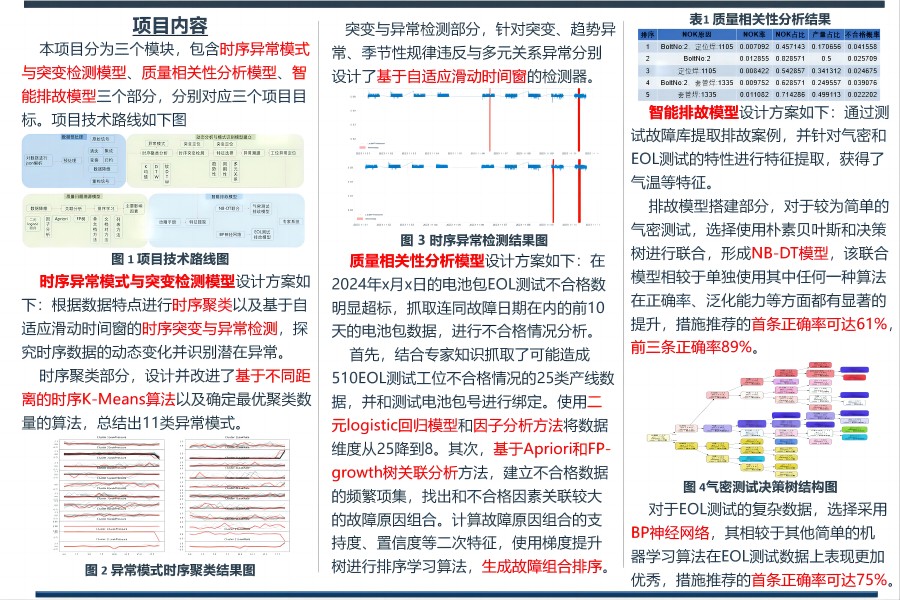 建立了基于时序聚类的时序异常模式识别模型和基于自适应滑动时间窗的突变检测模型;建立了基于故障传递链的质量问题溯源模型;分别基于朴素贝叶斯-决策树和BP神经网络建立了装配气密测试和EOL测试的智能排故模型;完成了最终系统的前后端开发任务,形成了新能源电池测试数据分析诊断专家系统。