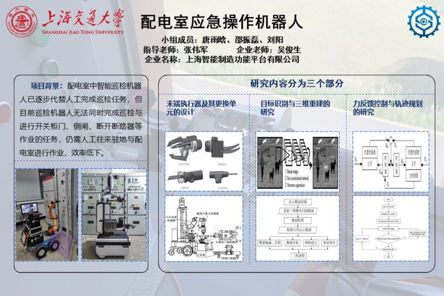 设计了一款六自由度被动柔顺平台,实现了对机械臂末端反作用力的调控;完成了开柜门末端执行器的设计与制造;完成了拉闸刀末端执行器的设计与制造。