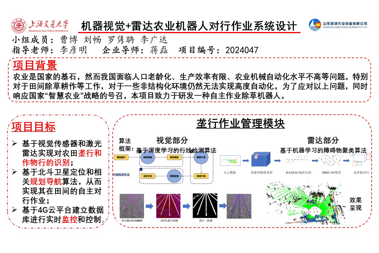 本项目致力于开发一种高度自动化的农业机器人,结合机器视觉与雷达技术,专门用于解决农业领域的除草耕作问题。该机器人针对非结构化的农田环境,通过整合先进的视觉传感器、激光雷达(LIDAR)、北斗卫星定位系统以及4G云平台技术,不仅能够提升作业效率和精度,还能显著减少对人工的依赖。此外,项目的开展还响应了国家对智慧农业发展的战略需求,旨在推动农业生产自动化和信息化的进程。
