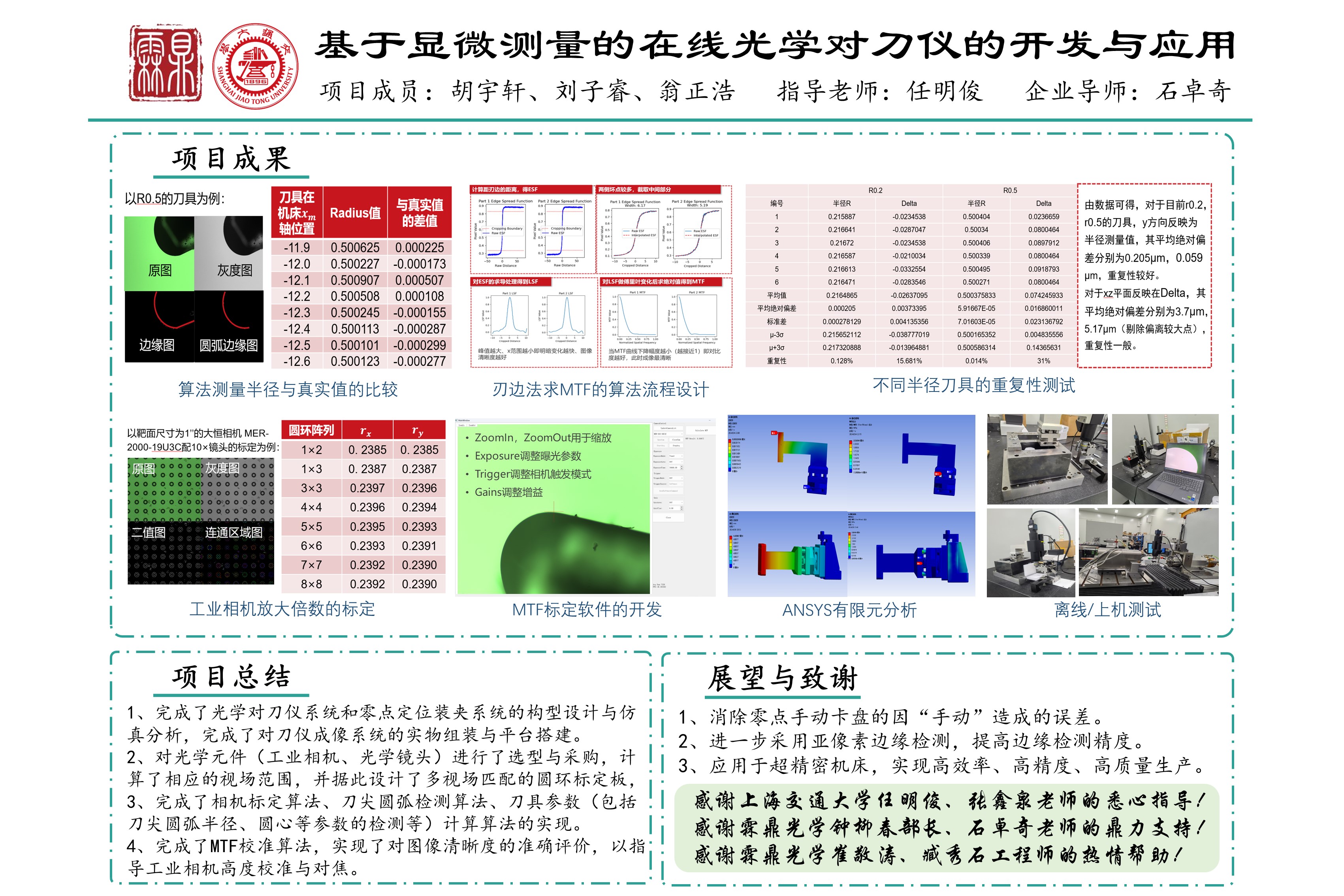 1、完成了光学对刀仪系统和零点定位装夹系统的构型设计与仿真分析,完成了对刀仪成像系统的实物组装与平台搭建,并进行了重复性探测与优化。