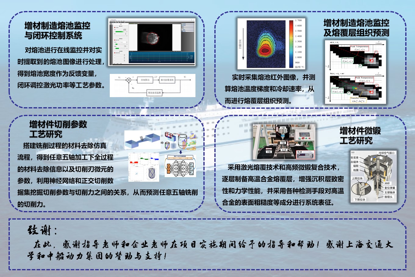 揭示增材高温合金的材料去除和加工表面创成机理,获得增材高温合金的最优切削参数组合,形成实验报告一份;获得高致密性、高强韧性的增材高温合金,形成工艺报告一份;以激光功率为调控对象,将熔池像素面积作为反馈变量,建立激光熔覆工艺闭环控制系统,采用PID控制算法,实时、自适应地调整激光功率,实现激光熔覆工艺参数自适应成形加工;针对激光熔覆增材制造过程,开展熔池监测以及熔覆层组织预测,形成增材制造过程中组织结构预测方法。