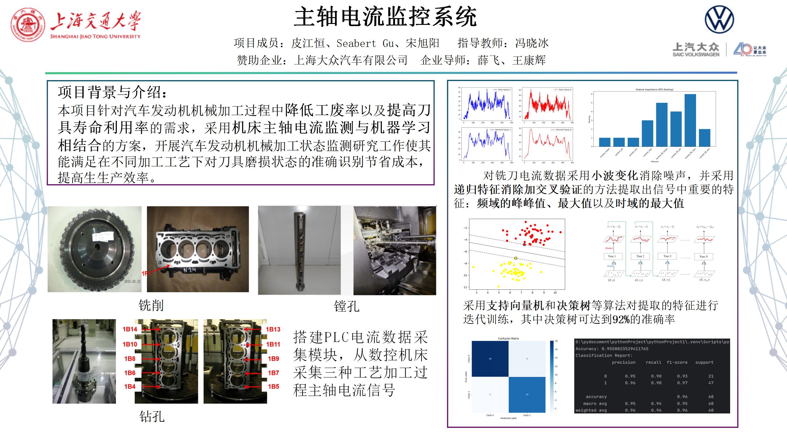 本项目旨在通过结合机床主轴电流监测与机器学习技术,开发一个监测系统来降低汽车发动机机械加工过程中的工废率并提高刀具寿命利用率。系统的核心是基于PLC的电流监测系统,该系统能够实时采集和显示电流信号,并存储数据供后续分析。通过实时监测主轴电流的变化,结合刀具状态分析和故障诊断功能,此系统可及时发现刀具损坏或异常磨损,预测刀具的使用寿命,从而在适当时机更换刀具,减少生产成本和提高生产效率。