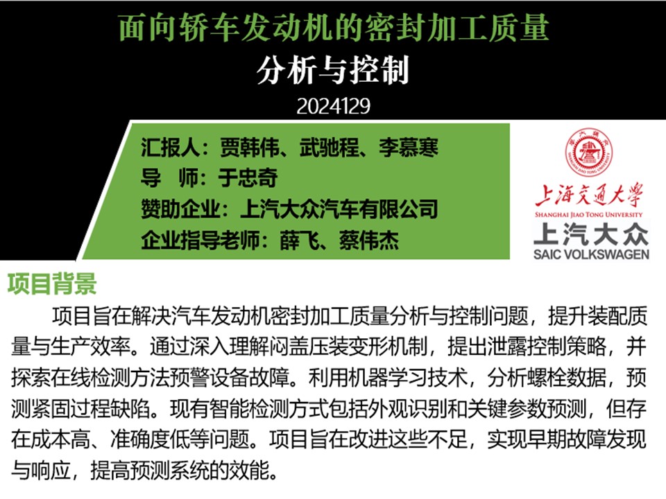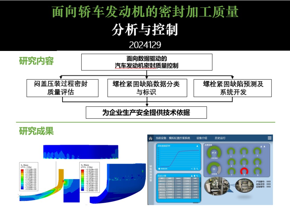 本项目聚焦于汽车发动机密封加工质量的提升,通过深入研究闷盖压装变形机制与螺栓拧紧数据,结合机器学习技术,构建高效准确的预测模型,实现对拧紧缺陷的早期预警与响应。同时,运用数值仿真技术深入分析压装过程,为在线监测与质量评价提供科学依据。项目旨在降低生产成本,提高生产效率与产品质量稳定性,为汽车制造行业的智能化发展贡献力量。