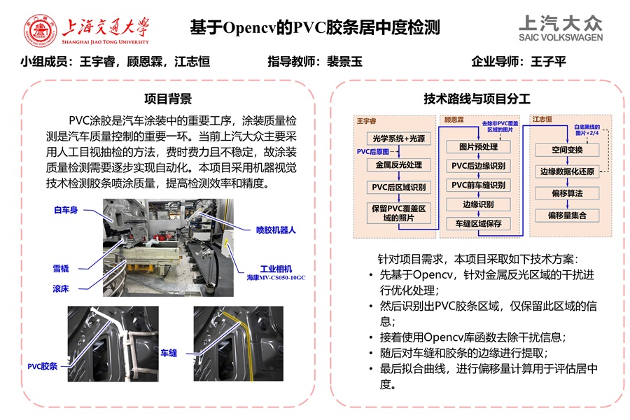 PVC涂料被广泛用于车身板金的切边及钣金缝处,起到防水密封、防止钣金切边锈蚀的作用。上汽大众采用自动化设备喷涂PVC胶条,喷涂过程中机器人发生偏移,车身晃动,PVC材料温度、压力、黏度波动,机器人枪嘴堵塞等因素,都可能导致胶条未能居中焊缝。当前上汽大众主要采用人工目视抽检的方法,此方法费时费力。本课题采用机器视觉技术,自动测量PVC胶条中心骨架与车缝偏移量,以解决胶条喷涂质量检测问题。