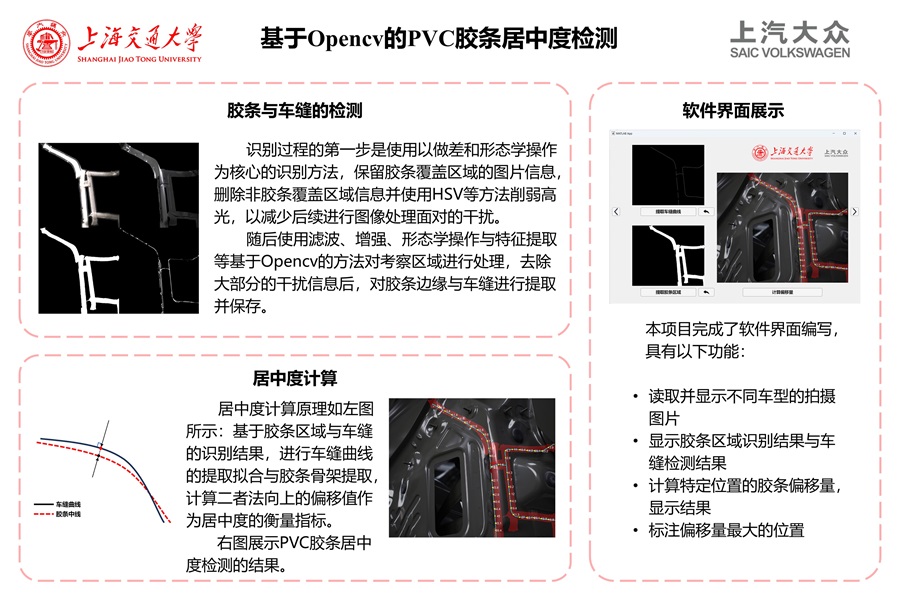 本项目完成了基于OpenCV的胶条居中度检测与计算系统。项目采用基于HSV的去高光算法,能够有效地排除金属表面高光对胶条识别的干扰,项目采用基于SSIM的胶条识别算法,可准确识别出多种车型上、灰白两色的胶条区域;采用滤波、增强、形态学操作等方法对胶条覆盖区域的车身图像进行处理,通过边缘检测算法提取车缝位置信息;对车缝曲线进行提取与拟合,同时提取胶条中心骨架,二者比较计算得到胶条偏移量,并进行了实际距离单位转化与误差讨论。