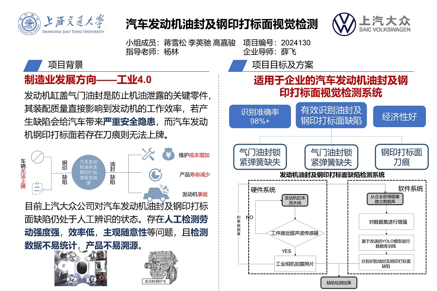 发动机是汽车的关键动力总成,发动机的产品质量是整车品质的重要组成部分。其中,车辆在车辆管理所上牌时会在钢印打标面进行标记,若钢印打标不清晰无法上牌。而若在发动机生产线上存在油封装配不合格问题,会导致发动机机油泄漏等质量事故,增加车辆维护成本。目前企业流水线上,对于上述产品质量检测仍采取效率低易出错的人工目测方法。因此,本项目旨在实现一套自动化、智能化的汽车发动机油封和钢印打标面的视觉在线检测系统。