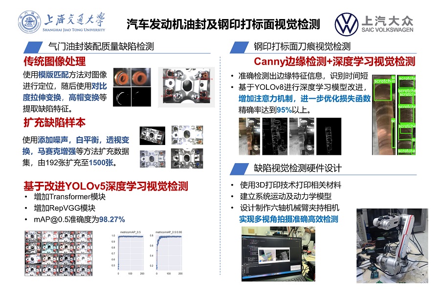 本项目围绕油封检测,钢印打标面刀痕检测,分别开展了基于数字图像处理、深度学习的视觉检测研究,收集制作了不同缺陷的样本,并通过数据增强方法对数据进行增强处理,随后基于YOLO深度学习框架改进相关算法对油封及刀痕的缺陷进行检测,提出油封装配质量的评价准则及钢印打标面视觉检测的合格性判定。同时设计完成了六轴机械臂来实现对检测设备的夹持与固定,可进行产线的检测,油封检测准确率到达98.2%,可一定程度上替代人工检测。