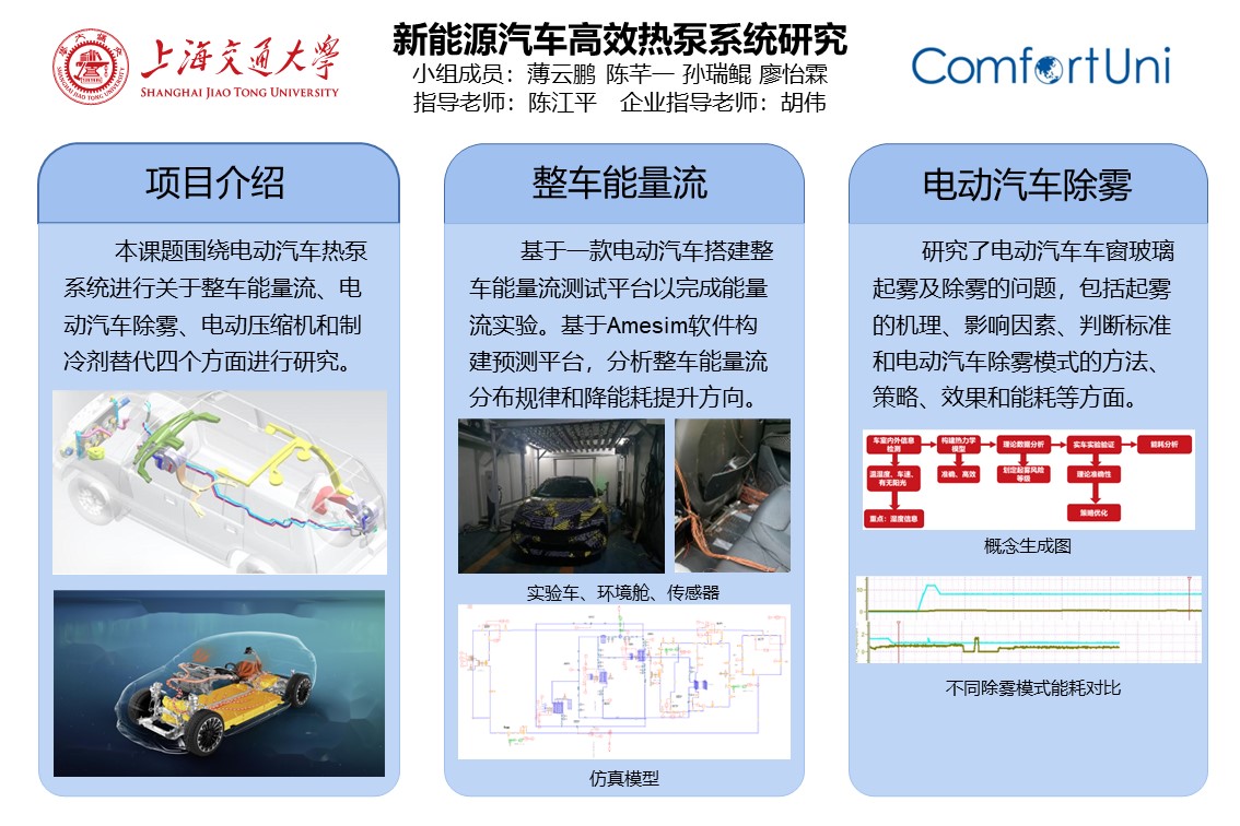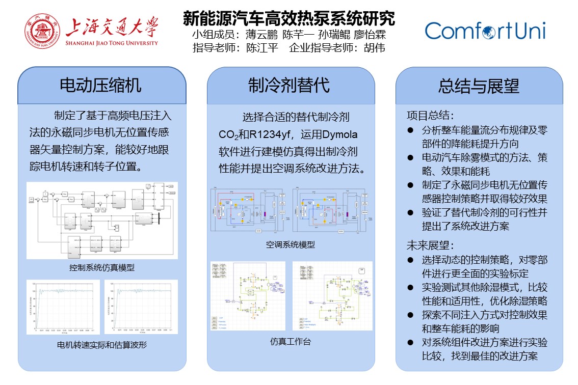 从虚拟仿真和实物验证两个纬度,研究能量的转移和传递过程,使得整车在不同的使用场景下能量利用率最高。通过对电动汽车车窗起雾及空调运行不同除雾模式进行研究,确立电动汽车高效除雾策略并分析其能耗。在永磁同步电机数学模型和矢量控制技术的基础上制定了永磁同步电机无位置传感器控制方案,并通过优化改进跟踪效果。筛选出合适的替代制冷剂并分析其较传统制冷剂的性能表现,对仿真数据进行分析计算以找寻降能耗的改进方案。